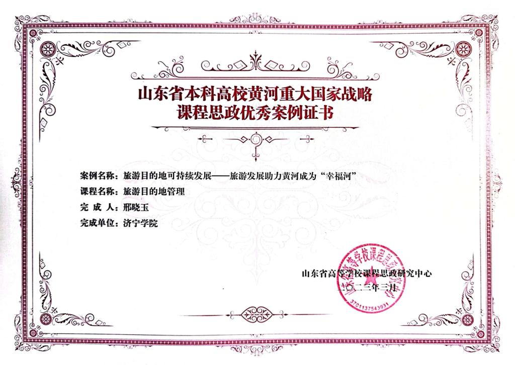 近日,山东省高等学校课程思政研究中心公布了“山东省本科高校黄河重大国家战略课程思政优秀案例”名单,儒商学院邢晓玉副教授的教学案例《旅游目的地可持续发展——旅游发展助力黄河成为“幸福河”》成功入选。据悉,该活动由山东省教育厅高教处指导,山东省高等学校课程思政研究中心组织开展,是山东省贯彻落实黄河流域生态保护和高质量发展战略、深入推进黄河重大国家战略融入高校课堂教学的重要举措。