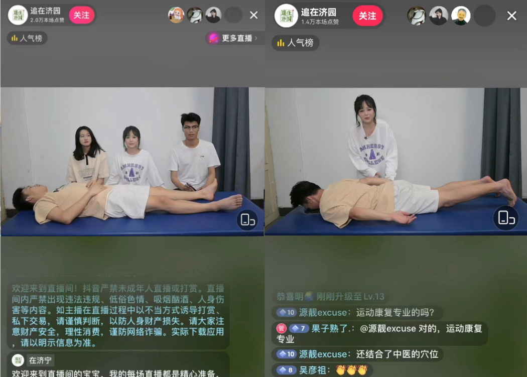 5月17日晚,体育学院与儒商学院联合开展运动康复科普线上直播活动,体育学院运动康复团队通过儒商学院校园追踪与调查协会“追在济园”抖音平台开展了运动伤病预防与治疗科普宣讲,线上进行了部分运动损伤的治疗,直播累计获赞2万余次。