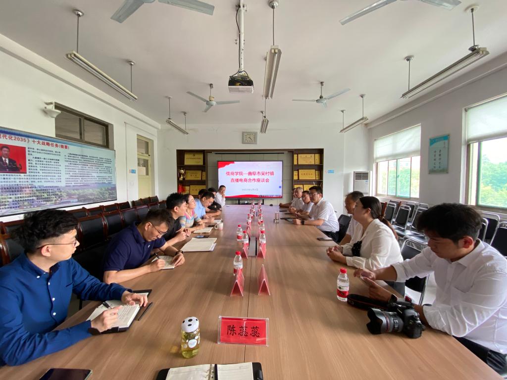 参会人员进行了充分讨论交流,董腾详细介绍了电子商务与法律专业发展现状及目前电商直播规划发展情况,徐琮针对于学生依托电商发展进行的校企合作及互联网大赛等大创比赛进行介绍,赵月阳针对于吴村镇依托电商直播进行全域化推广规划设想进行介绍。吴村镇电商负责人周军、孔聪聪、徐文政,分别针对于目前各自所经营中电商直播的经验进行分享,并对于出现的问题进行沟通探讨。双方初步达成共建乡村振兴基地的合作意向。