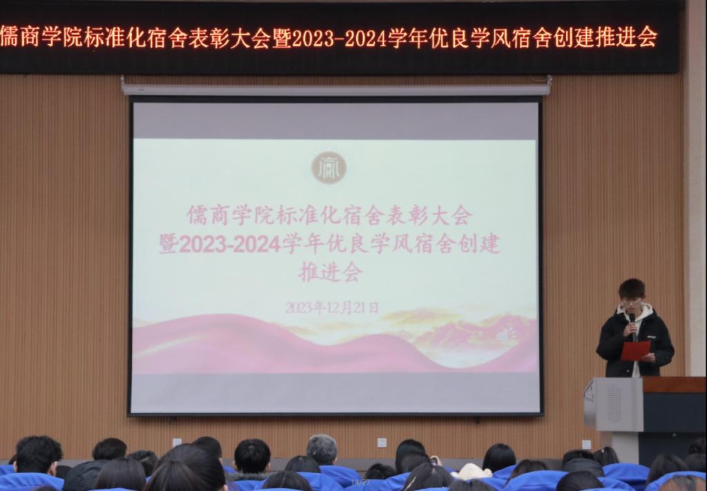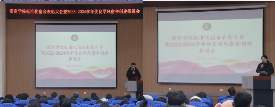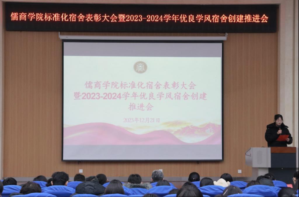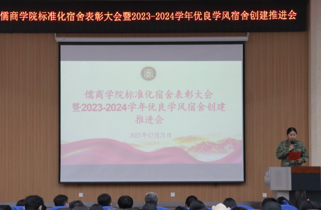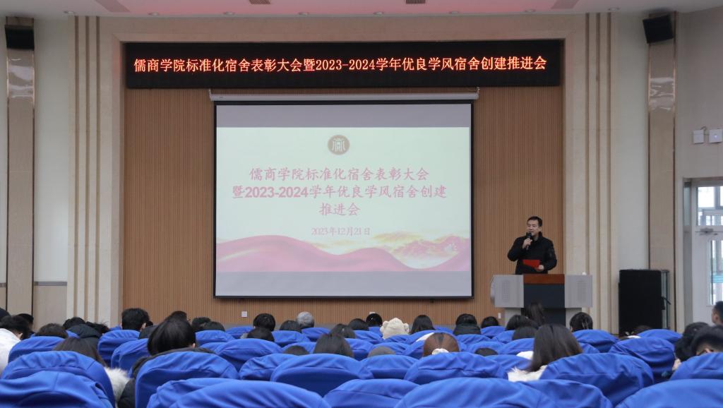 为充分发挥宿舍建设在学生成长成才中的凝聚、引导、服务作用,提升学生“自我教育、自我管理、自我服务”的意识,真正把学生宿舍建设成为学生生活、学习、文化、社交、锻炼、育人的温馨小家、励志之地和远航的港湾。12月21日下午,儒商学院在3号楼报告厅举办了标准化宿舍创建活动表彰大会暨2023-2024学年优良学风宿舍创建推进会,学院党委书记乔东华、党委副书记孔国良、团委书记袁芬、全体辅导及180余位学生宿舍代表参加本次大会,大会由辅导员陈梦园主持。