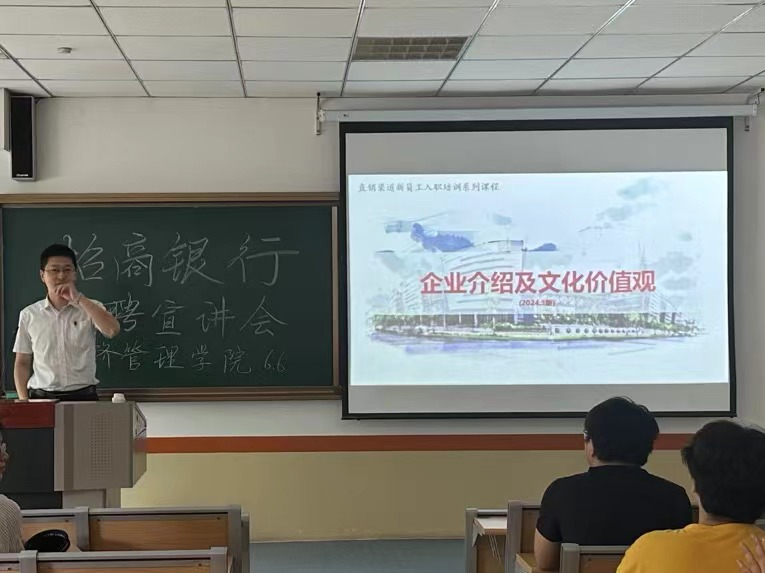 招商银行人事经理邢庆伟老师通过PPT 演讲的形式从招商银行的历史发展、业务范围、企业文化展开介绍;紧接着,邢老师人向同学们详细介绍该企业关于人才培养方面的规划,他表示招商银行将为新入职员工提供全面的培训和广阔的晋升空间;最后,邢老师针对同学们提出的问题在校园招聘岗位设置、职业发展路径、优厚福利待遇等内容方面又做针对性补充。