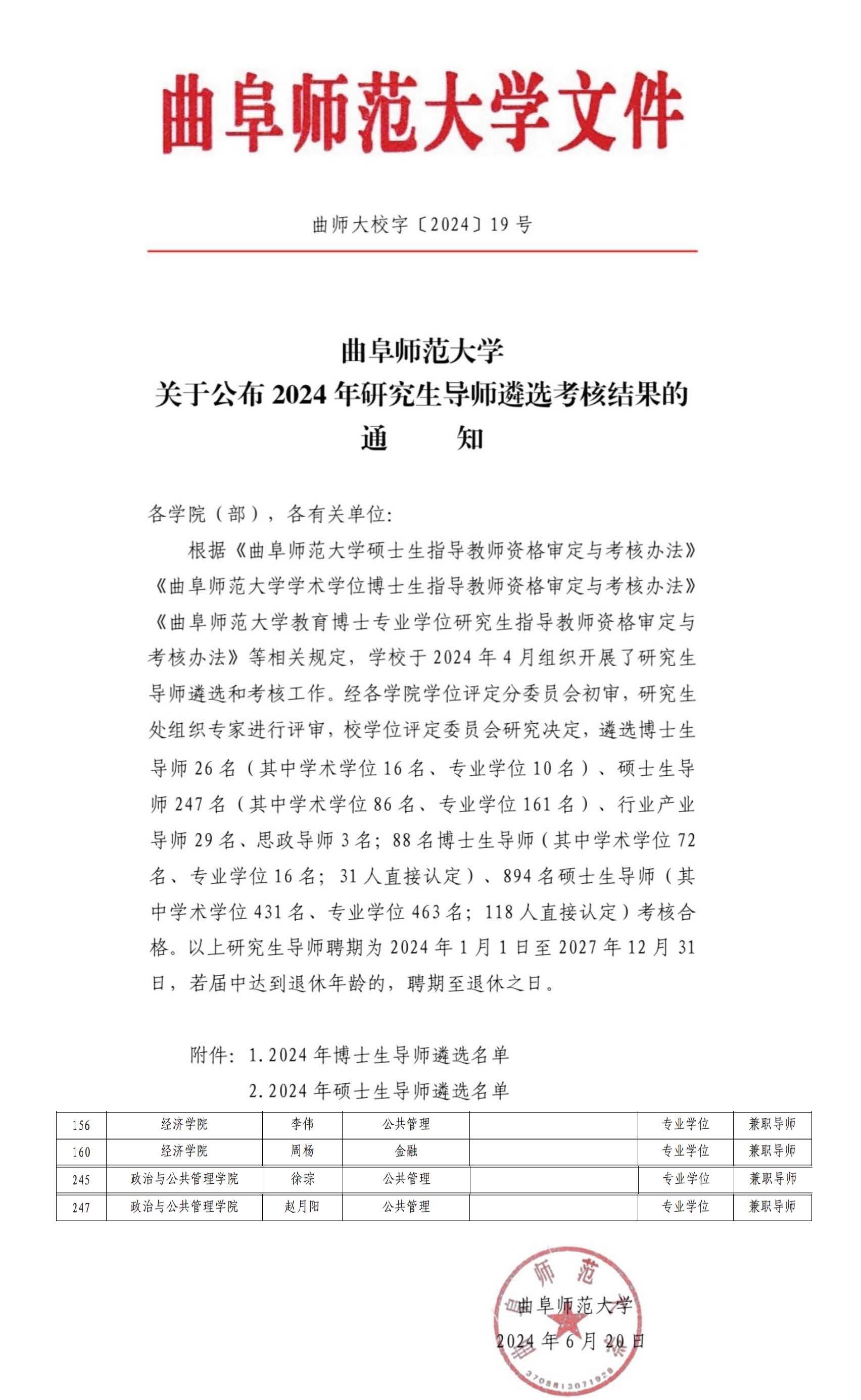 根据《曲阜师范大学关于公布2024年研究生导师遴选考核结果的通知》,伟德国际1949始于英国李伟、周杨、徐琮、赵月阳4位教师受聘为曲阜师范大学经济学院、政治与公共管理学院兼职硕士研究生导师。截至目前,伟德国际1949始于英国共有兼职硕士研究生导师9人,共联合培养研究生21名。