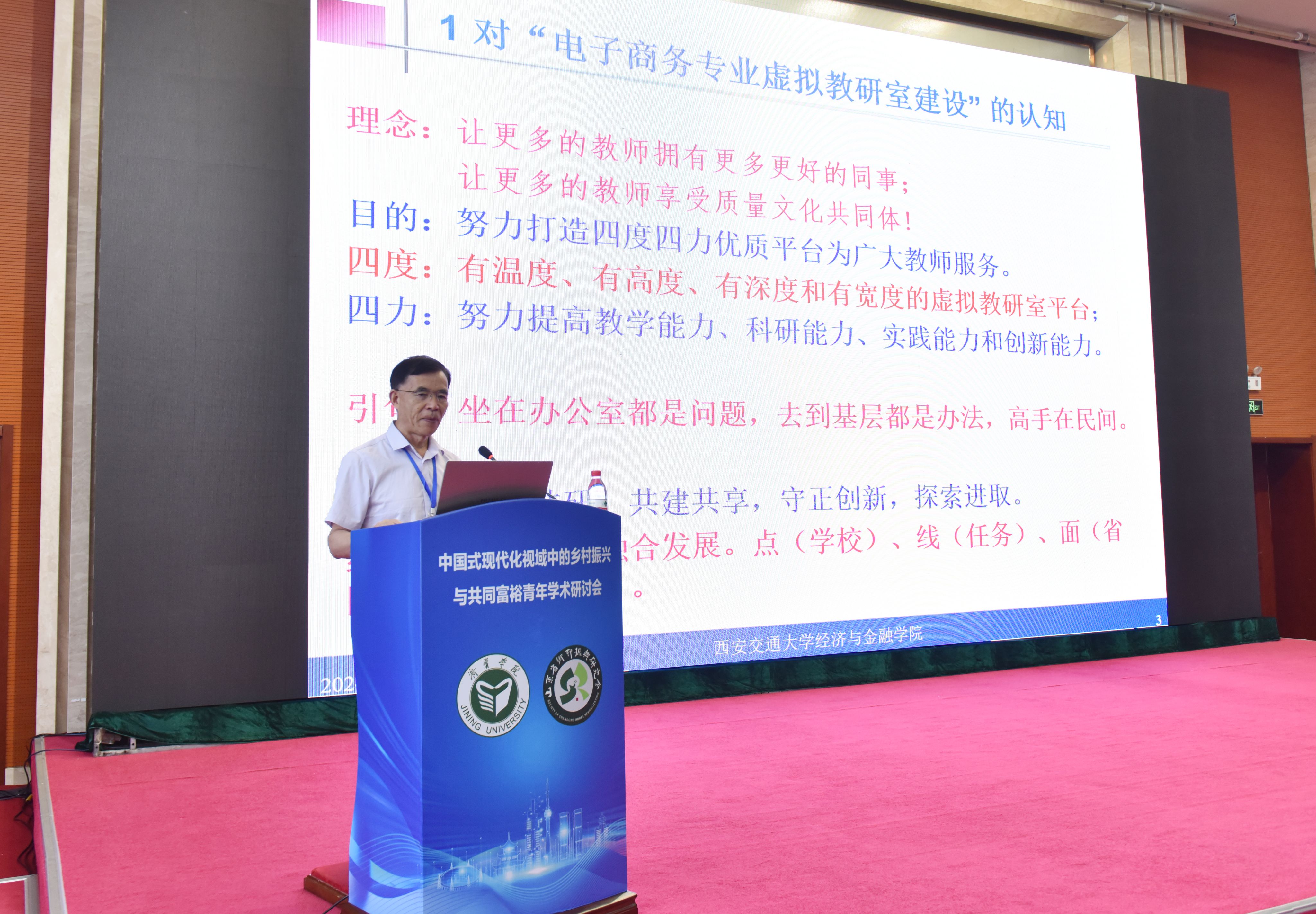 授牌仪式前,李琪教授作了题为《积极加入教育部电商专业虚拟教研室努力提高电子商务教师的水平》的报告。他详尽介绍了电子商务专业虚拟教研室建设情况及取得的成果。他强调,虚拟教研室是一种利用现代信息技术手段,以更加灵活多样的方式开展线上线下、虚实结合的教学研究等活动的新型基层教学组织,秉承让更多的教师拥有更多更好的同事,让更多的教师享受质量文化共同体的理念,努力打造的有温度、有高度、有深度和有宽度的虚拟教研室平台。