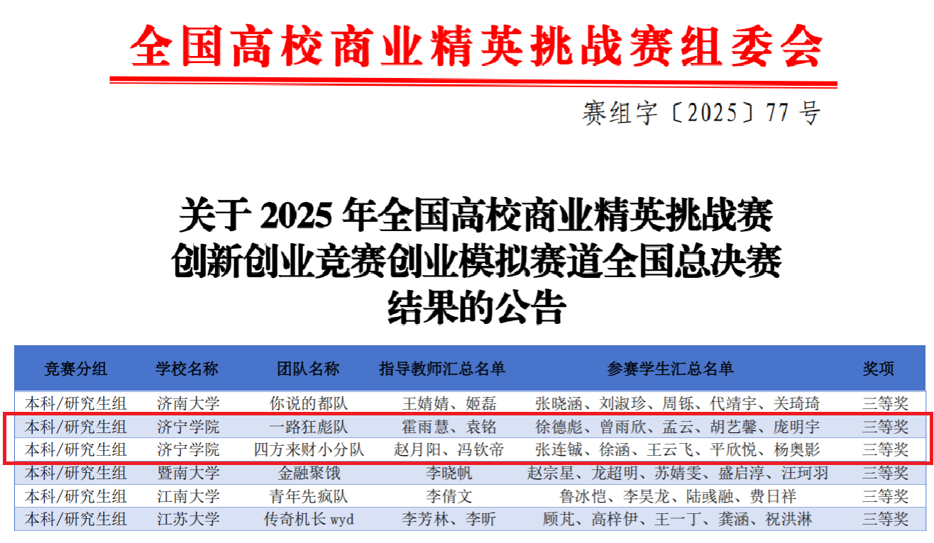 近日,中国国际贸易促进委员会商业行业委员会、中国国际商会商业行业商会和中国商业经济学会联合主办的2025年全国高校商业精英挑战赛创新创业竞赛创业模拟赛道全国总决赛落下帷幕。经过激烈角逐,我院代表队斩获国家级三等奖2项。