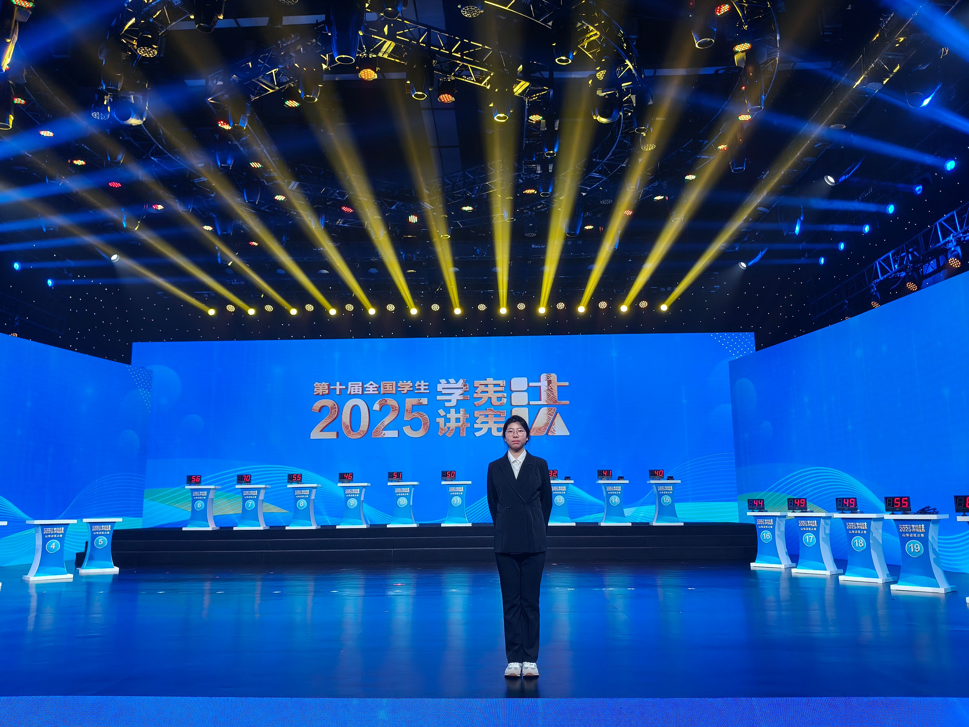 今年法治素养竞赛创新赛程,新增笔试环节,笔试成绩前20名选手晋级电视知识答题环节,电视知识竞赛分为必答题、抢答题、主观题三个环节,以宪法为主体,围绕习近平法治思想、教育法律、中华民族共同体意识、国家安全、公民权利等内容展开。李娟同学在比赛过程中沉着冷静、严谨作答,在笔试及电视知识答题环节均展现出扎实的专业功底和良好的法治素养。
