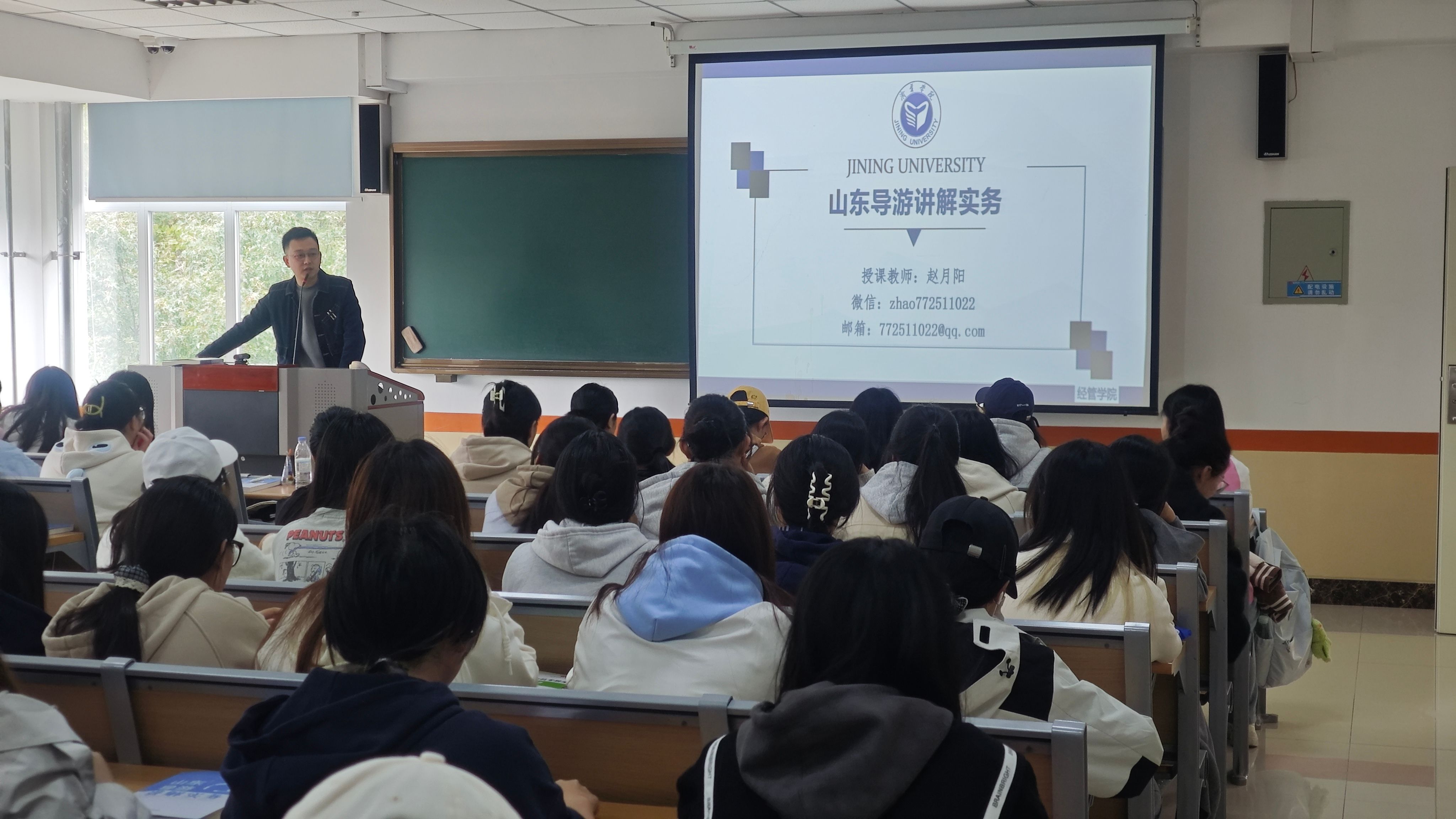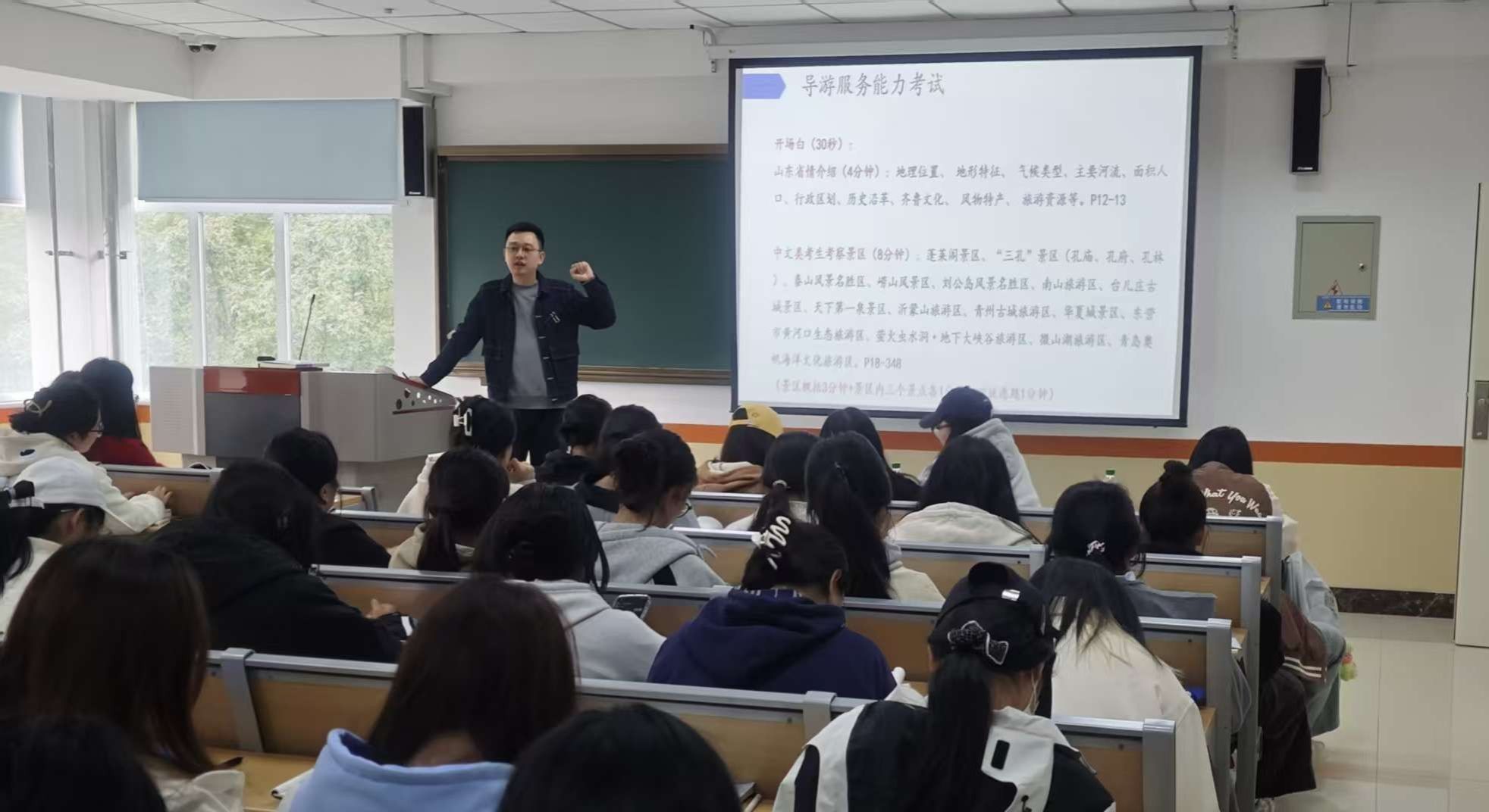讲座中,赵月阳首先对全国导游资格证考试的整体流程、科目构成及考核形式进行了介绍。他结合自身丰富的教学与考评经验,依托参编的导游考试指定教材《山东导游讲解实务》一书,重点讲解了全国导游资格证考试中的导游服务能力面试环节。为同学们梳理了从备考到应试的全周期规划,强调了端正态度、尽早准备的重要性。