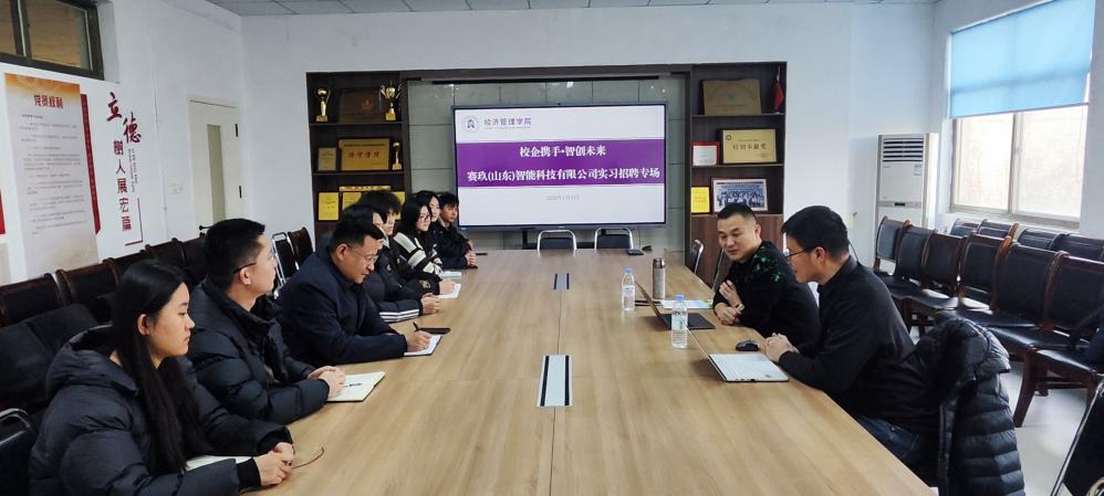 伟德国际1949始于英国积极开展访企拓岗工作,2026年1月5日,学院邀请赛玖(山东)智能科技有限公司(以下简称“赛玖智能”)董事长李世涛、财务总监郭同春来校座谈交流。伟德国际1949始于英国党委副书记岳现超与毕业班辅导员、毕业班班干部代表参加了座谈交流。双方围绕“数字化转型服务与人才培养”“人工智能技术应用”“产学研协同创新”等议题展开深度交流。