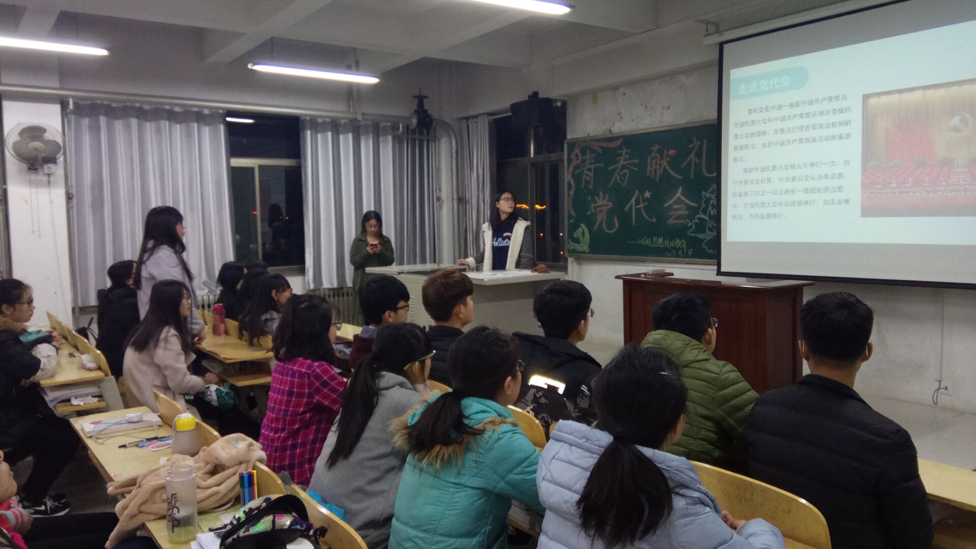 2017年3月9日晚7点,经济与管理系各团支部开展了以“青春献礼党代会”为主题的团日活动。 各班积极准备,热情参与,各显其能,以PPT、党史知识竞答等形式引导大家解和学习党的相关知识,同学们踊跃发言,互相交流,班级其乐融融。 本次活动不仅使同学们对党团有了更加深刻的认识与了解,提高了大学生的社会责任感,同时也使大家真正感受到爱国的荣誉感和激情,以奋发有为的精神风貌和优异的学习成绩绽放光芒。