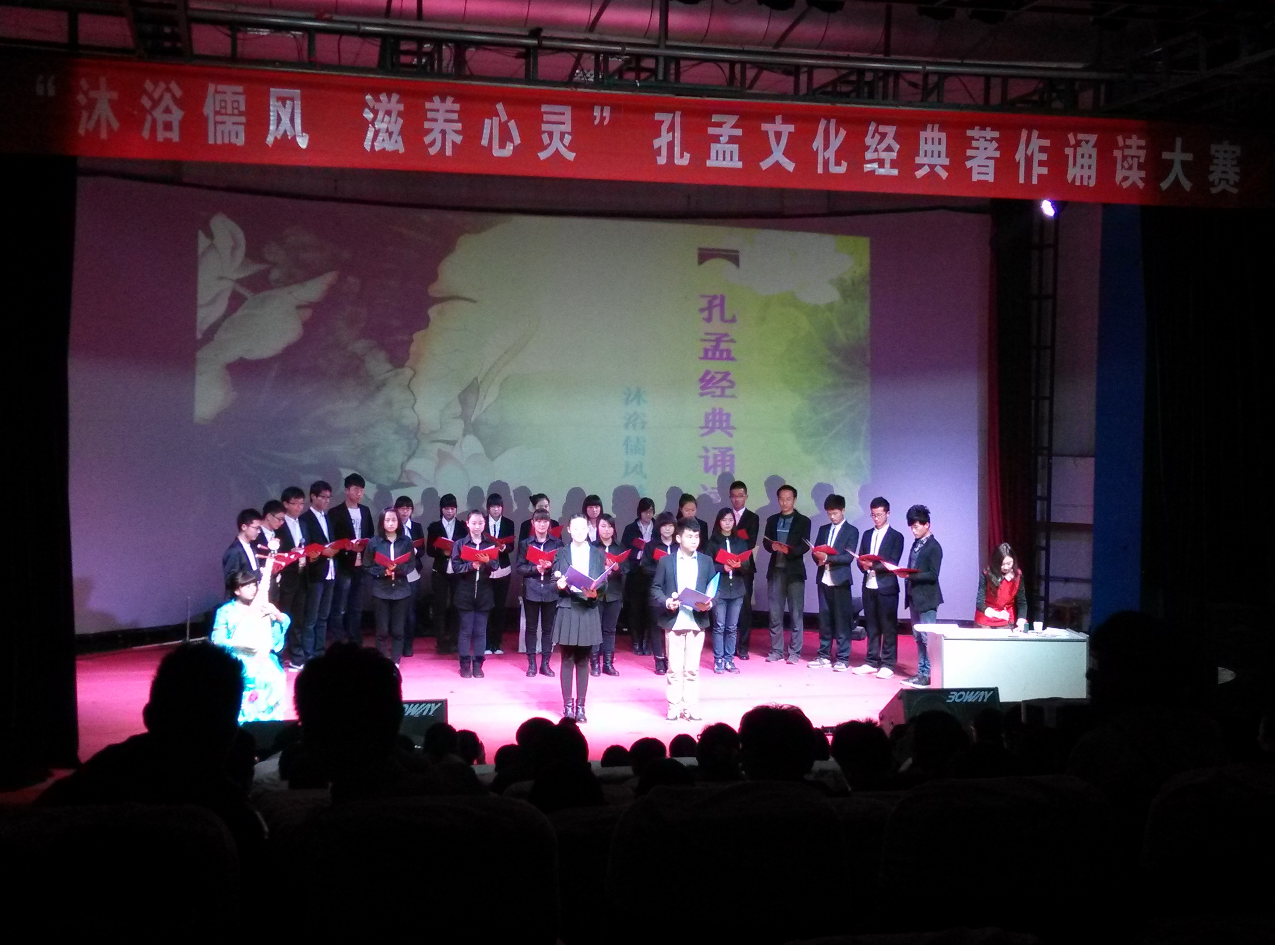 2013年12月5日晚上七点,由校团委主办,伟德国际1949学生委员会承办的孔孟颂读比赛在伟德国际1949文科楼举行。 由经济与管理系戚祥雨、刘海雷等带领的二十位大一同学第七个出场,他们的参赛内容包括琵琶曲、书法展示、孔孟颂读等,精彩的的展示赢得了观众的阵阵掌声和评委的一致好评。最终,经济与管理系以优异的成绩和独特的风格赢得此次比赛的一等奖。 通过孔孟颂读大赛,拉近了各系之间的距离,增进了各系之间的联系,同时也给同学们一个展示自己的平台,丰富了同学们的课余生活!