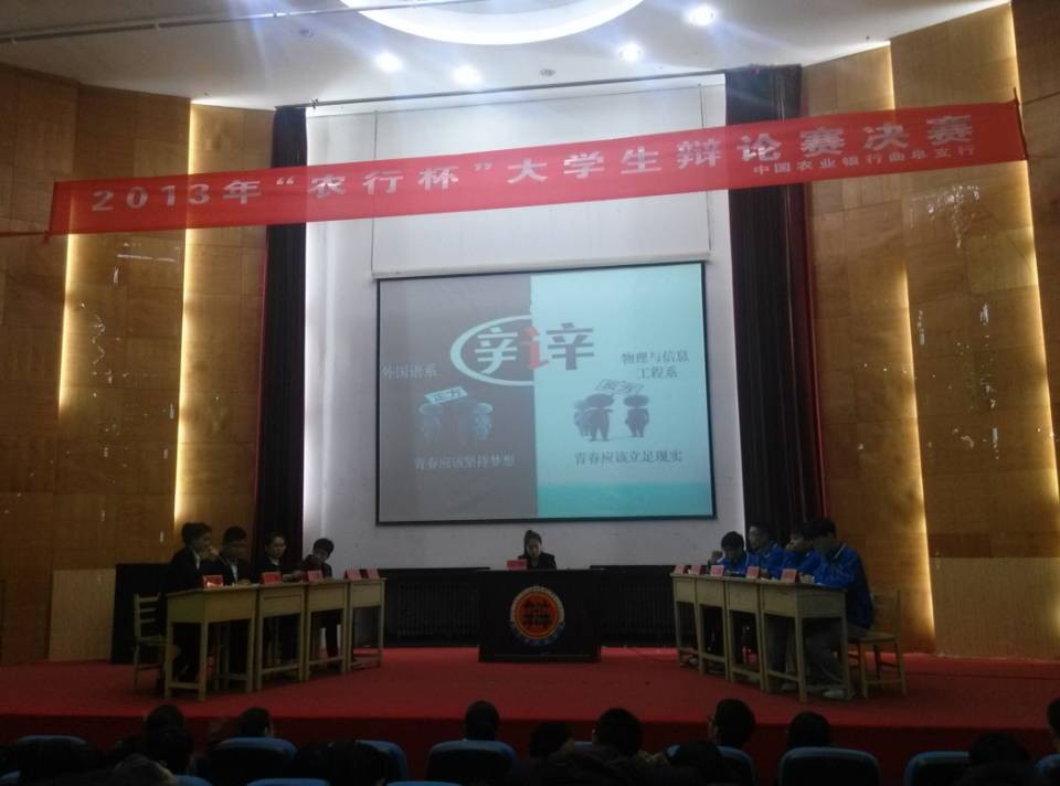 2013年12月10日晚7:00,我系“农行杯”大学生辩论赛决赛第一场在理科楼报告厅隆重举行。我系党总支书记乔东华、团总支书记赵家凯、辅导员孔德涛、徐邦震及生命科学与工程系团总支书记孔翠、辅导员贾春旺等出席了本次比赛。