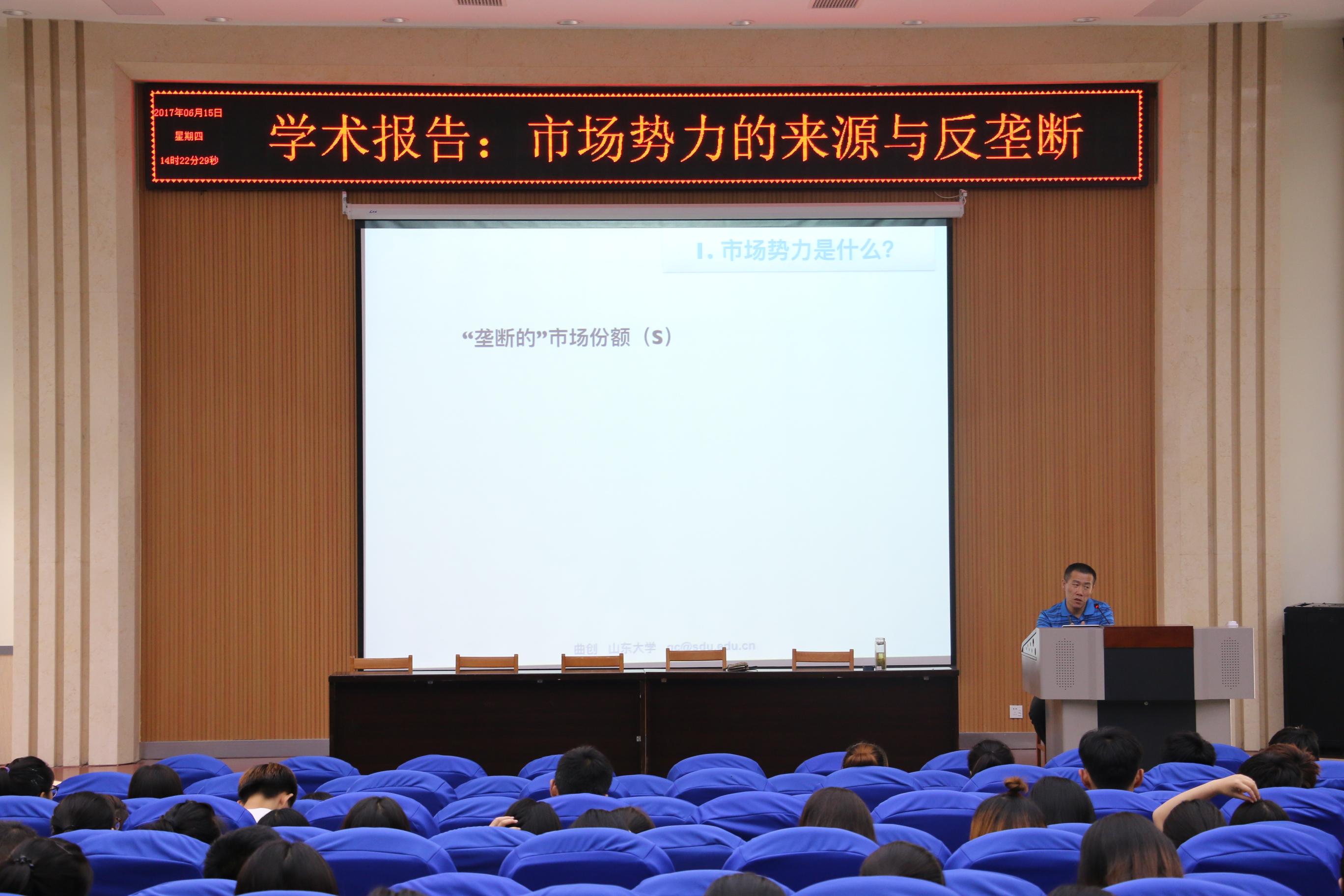 2017年6月15日下午两点半,由山东大学经济学院教授、博士生导师曲创在三号楼报告厅做题为“市场形式的来源和垄断”的学术报告。