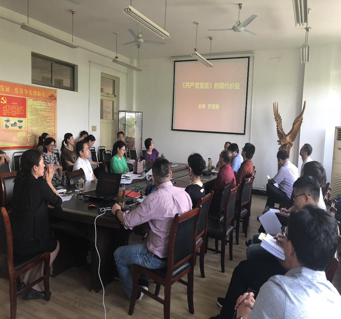 党总支书记陆波同志首先带领大家回顾了马克思的一生,再次学习了习近平总书记在马克思诞辰200周年大会上的重要讲话精神,通过“九个思想”指明新时代共产党人应该如何学习马克思。系主任齐慧丽引领全体党员干部重新学习了《共产党宣言》,讲述了《共产党宣言》现代价值和在中国的传播演进历史,指出要把《宣言》蕴含的科学原理运用到“四个伟大”中去,谱写新时代中国特色社会主义的新篇章。接下来,全体党员同志积极发言参与讨论,大家从不同角度阐述了《共产党宣言》对当代中国的指引作用和对保持党的先进性和纯洁性的保障作用,一致认为《共产党宣言》作为科学社会主义理论著作,对实现中华民族伟大复兴具有重要的指导意义。