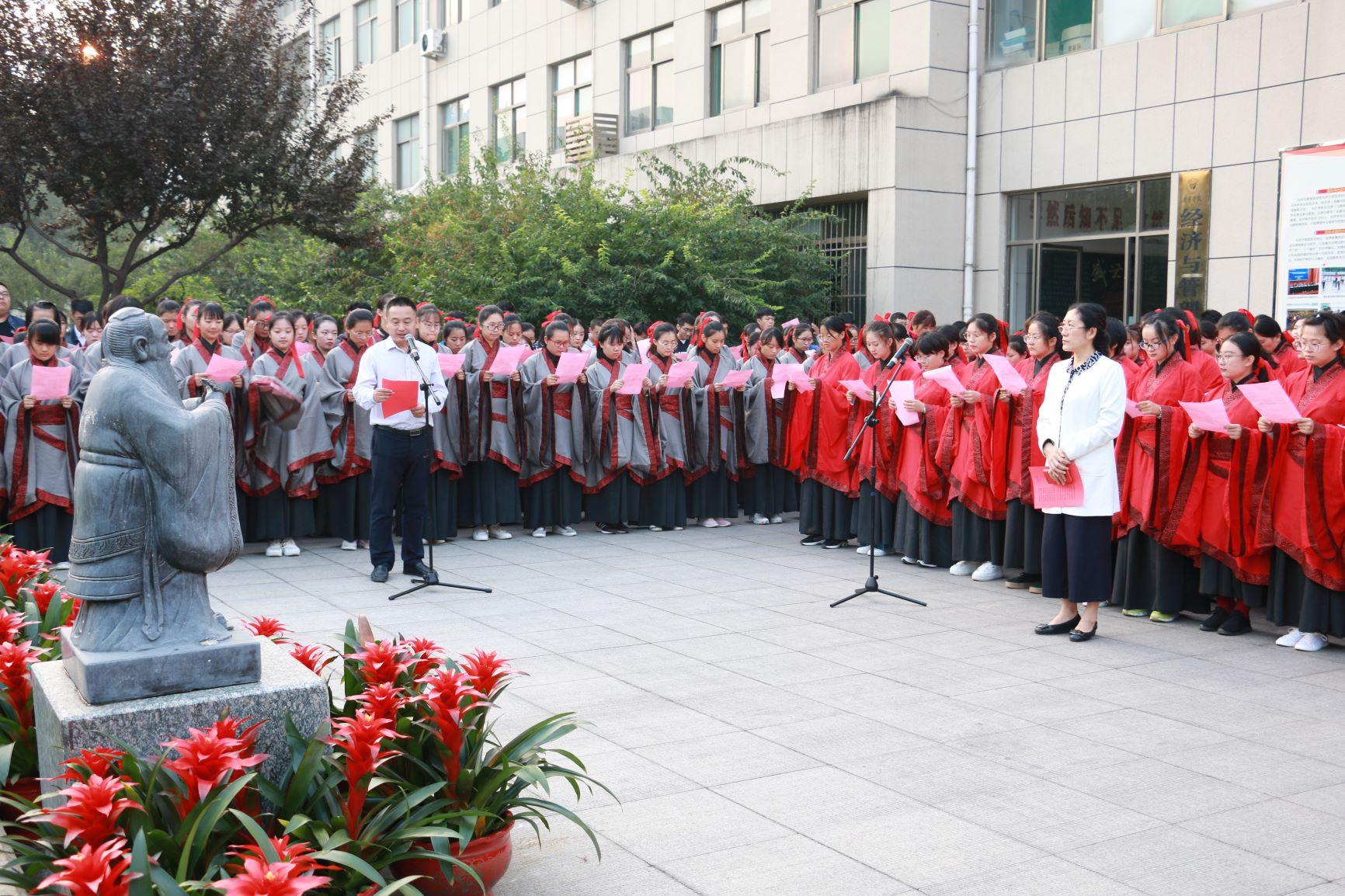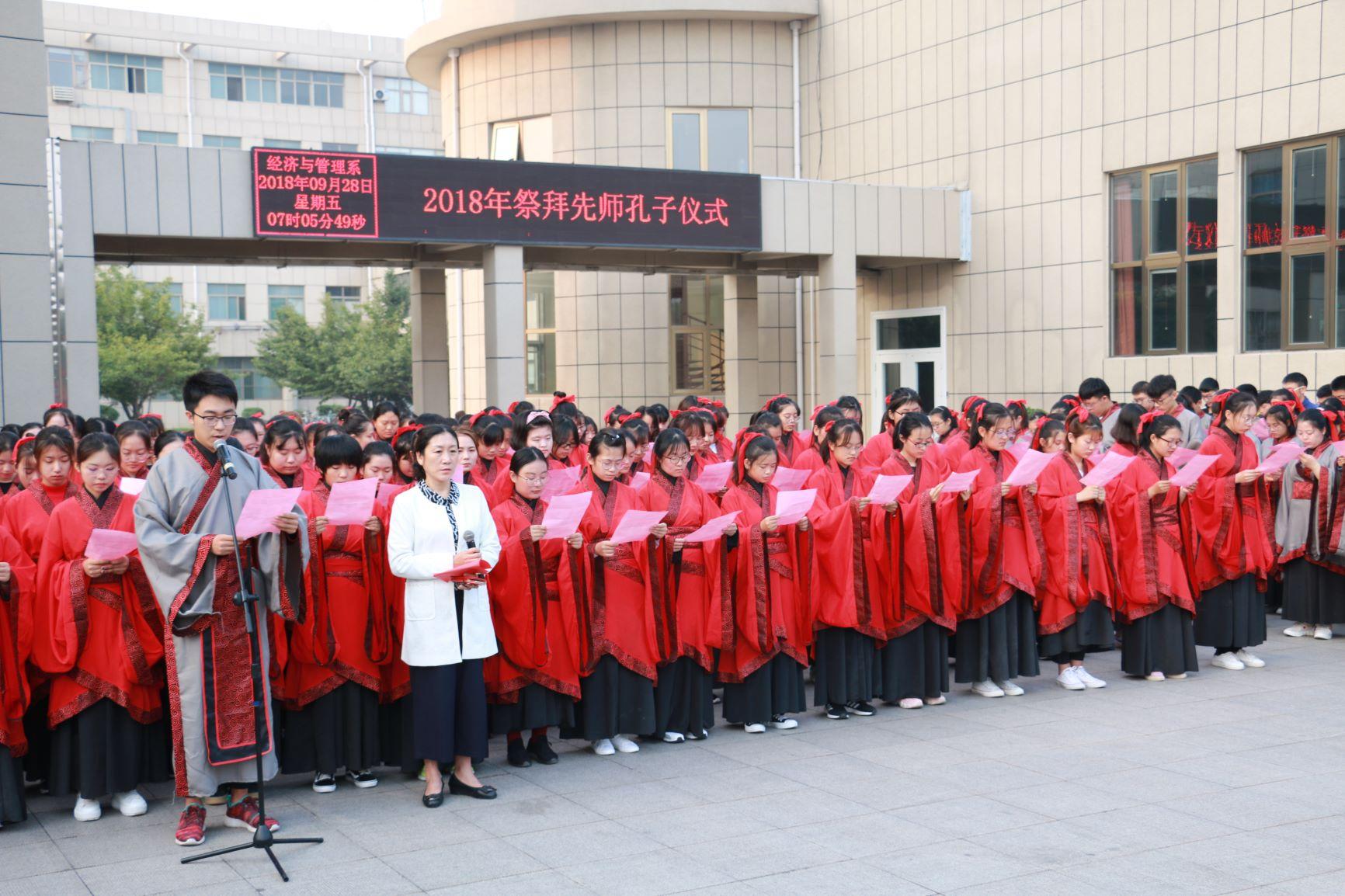 9月28日清晨,经济与管理系师生在孔子像前举办祭孔礼,祭拜中国伟大的思想家、教育家孔子诞辰2569周年。经济与管理系主任齐慧丽、党总支书记陆波、党总支副书记赵家凯、全体辅导员以及千余名同学参加了此次活动。陆波书记主持仪式。