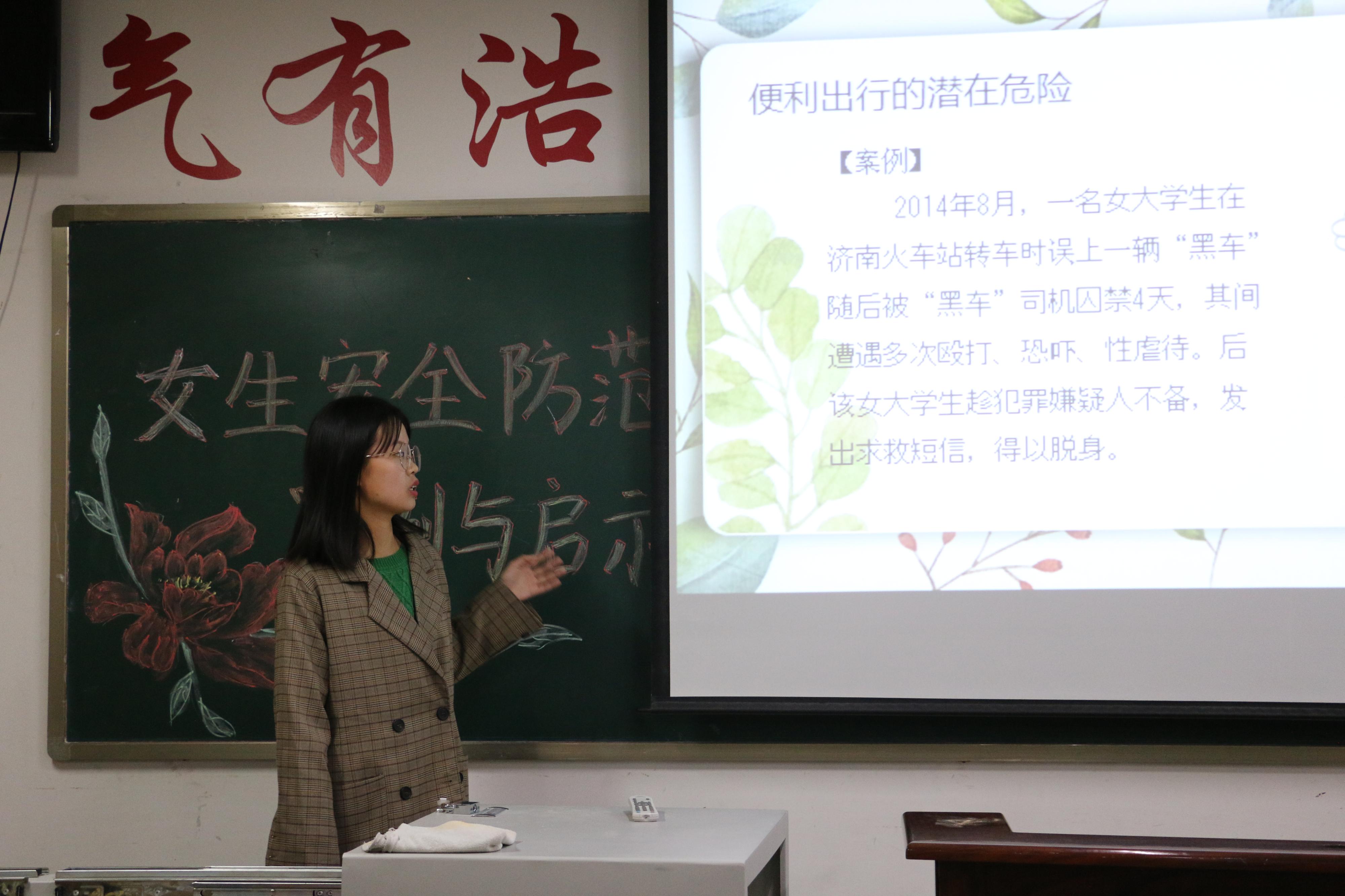活动开始,主持人着重强调了女生安全防范的重要性,围绕如何提高同学们的安全防范意识以及面对危险情况采取的措施等问题展开话题,并且运用具体实例向同学们讲授女生在危险时刻应如何保护自己,警示同学们提高自我保护意识,学会自尊、自爱、自强、自立、自重。随后在讨论环节,同学们一同探讨分享了遇险时的自我保护方法,弥补了防范意识、防范能力方面的不足。