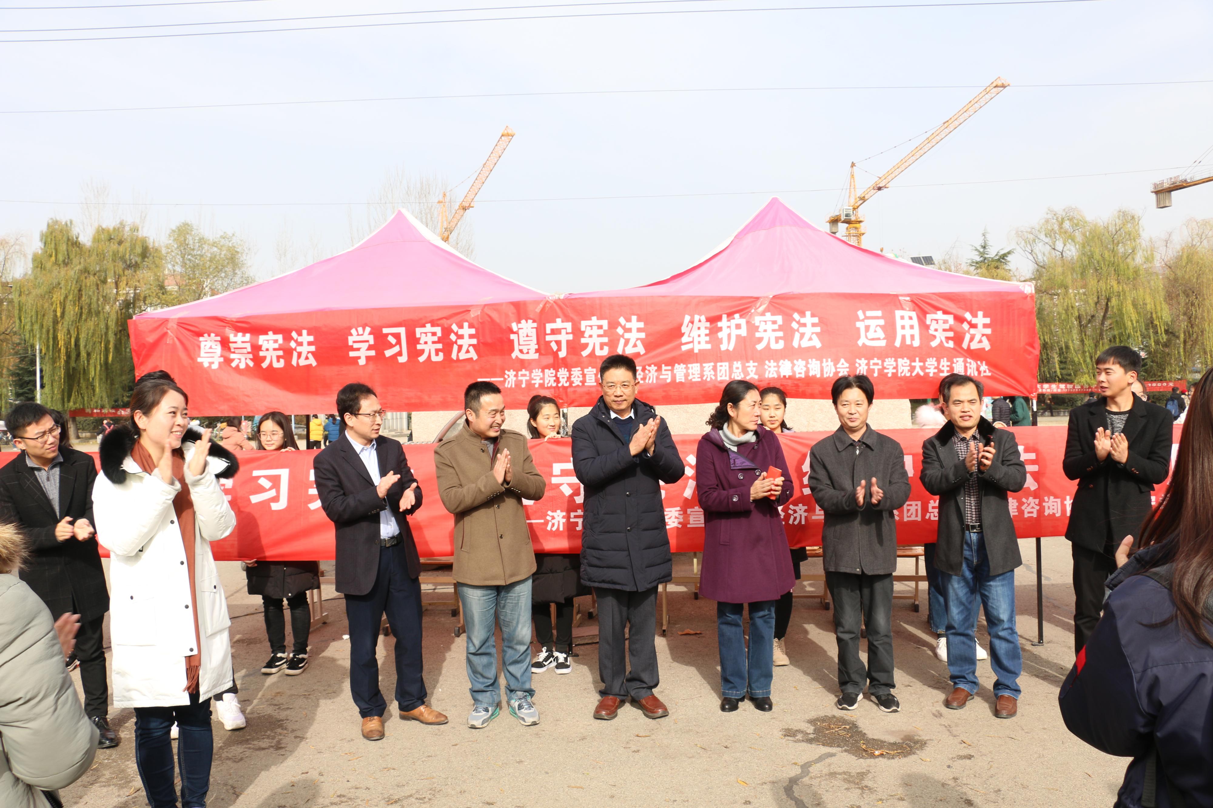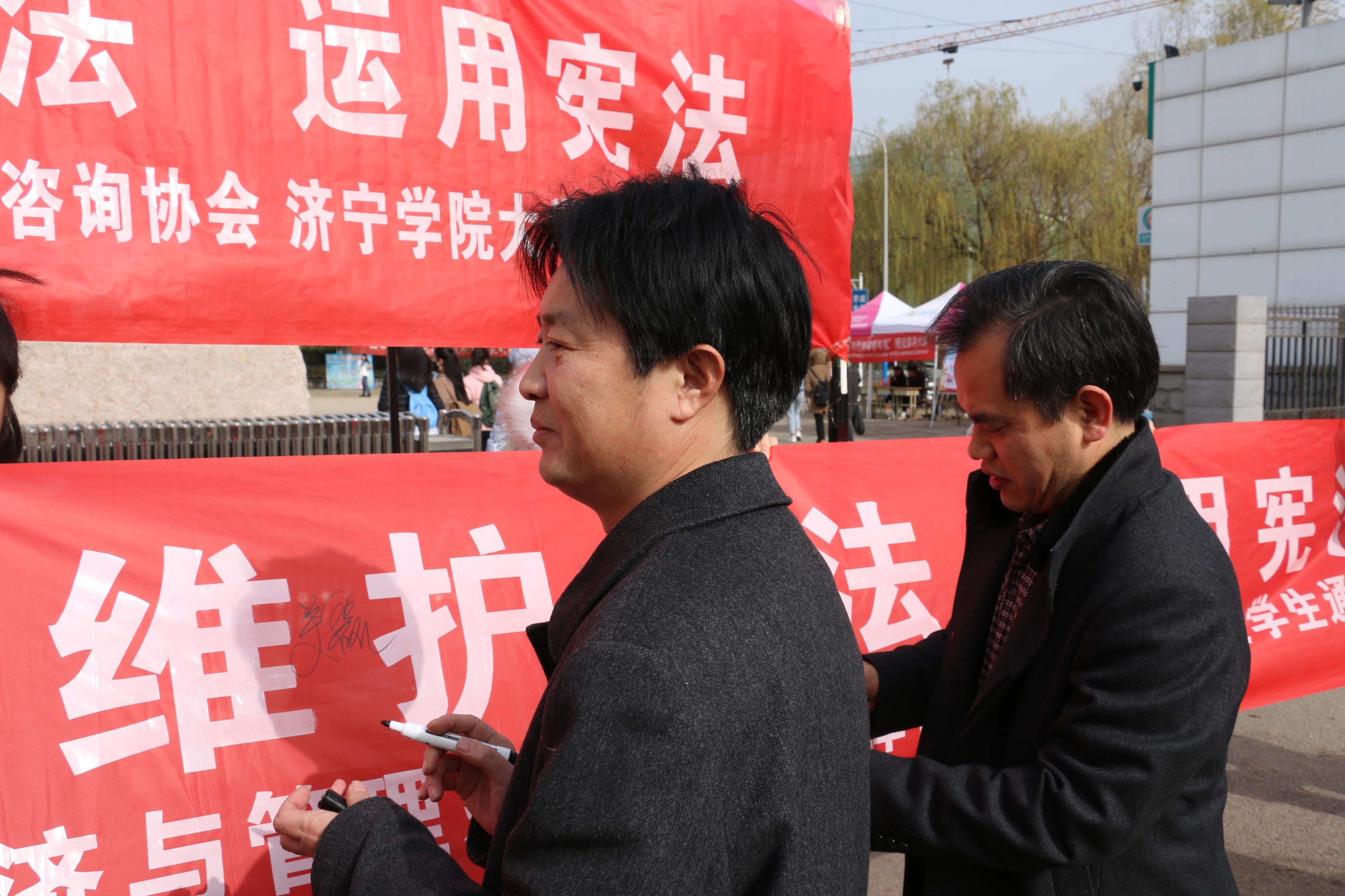 活动现场,各部门展台通过悬挂横幅、发放宣传资料、提供法律咨询等方式,重点宣传以宪法为核心的中国特色社会主义法律法规,法律援助协会的成员向广大师生普及宪法知识、解答疑惑。最后,众多同学在宪法宣传横幅上签下了自己的名字,承诺会遵守宪法并且坚定的拥护宪法,做一个与法同行的大学生。活动现场气氛十分热烈。