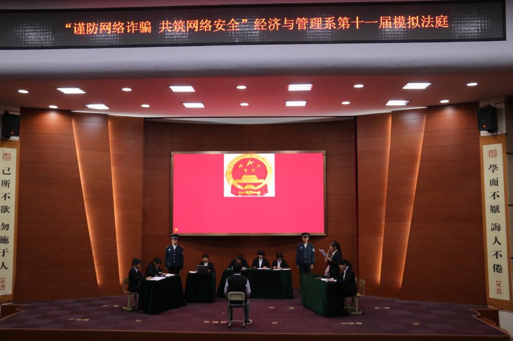 2019年11月5日晚,由经济与管理系团总支和法律咨询协会主办的第十一届“谨防网络诈骗,共筑网络安全”模拟法庭活动在理科楼报告厅顺利举行。经济与管理系(儒商学院)学生会代表及各社团学生代表出席本次活动,2019级全体同学参加。