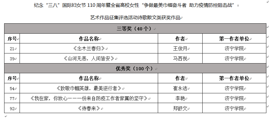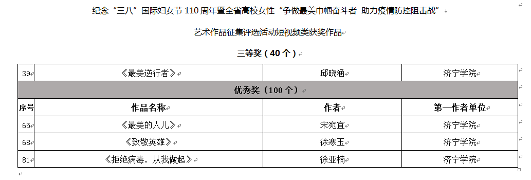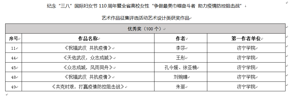 为纪念“三八”国际妇女节110周年,2020年“三八妇女节”期间,向奋战在战疫一线的优秀女性致敬,凝聚共克时艰的强大正能量,中共山东省委教育工委和山东省妇联共同组织开展了高校女性助力疫情防控阻击战艺术作品征集评选活动。此次活动全省共140余所高校参与,学校工会(妇女工作委员会)和团委共同组织,我校广大女教职工及学生积极参与,参加了艺术设计、短视频、书画摄影、诗歌散文等4大类作品,创作出了一大批主题鲜明、情感真挚、有一定深度和艺术价值的作品。