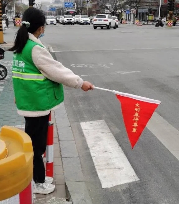 志愿者们身穿红马甲,手持交通引导旗,守在交通路口对行人和非机动车遵守交通规则进行引导。在活动过程中,志愿者们纠正行人和非机动车辆乱闯红灯行为,遇到老人、小孩过斑马线,他们立即上前帮助,提醒注意交通安全。