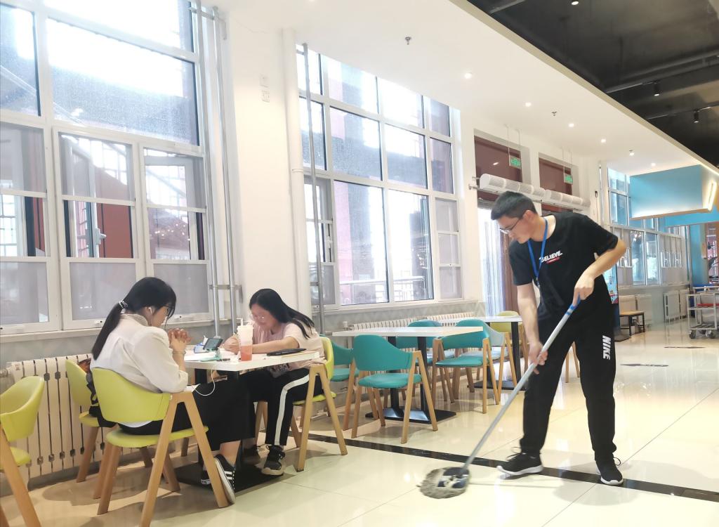 在活动过程中,志愿者们积极参与打扫,分工明确,擦净桌子,摆放好板凳,拖地,保持了广场餐厅的干净卫生。看到不利于卫生保持的行为及时进行提醒并纠正,并告知同学们维持餐厅卫生的重要性。