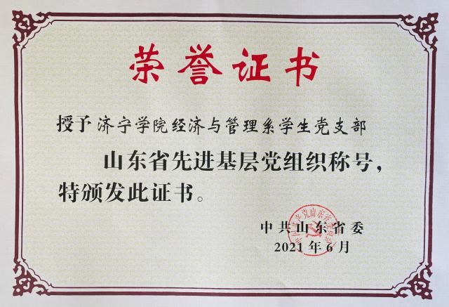 近日,中共山东省委发布了关于表彰山东省优秀共产党员、优秀党务工作者和先进基层党组织的决定,儒商学院(原经济与管理系)学生党支部荣获“山东省先进基层党组织”称号。