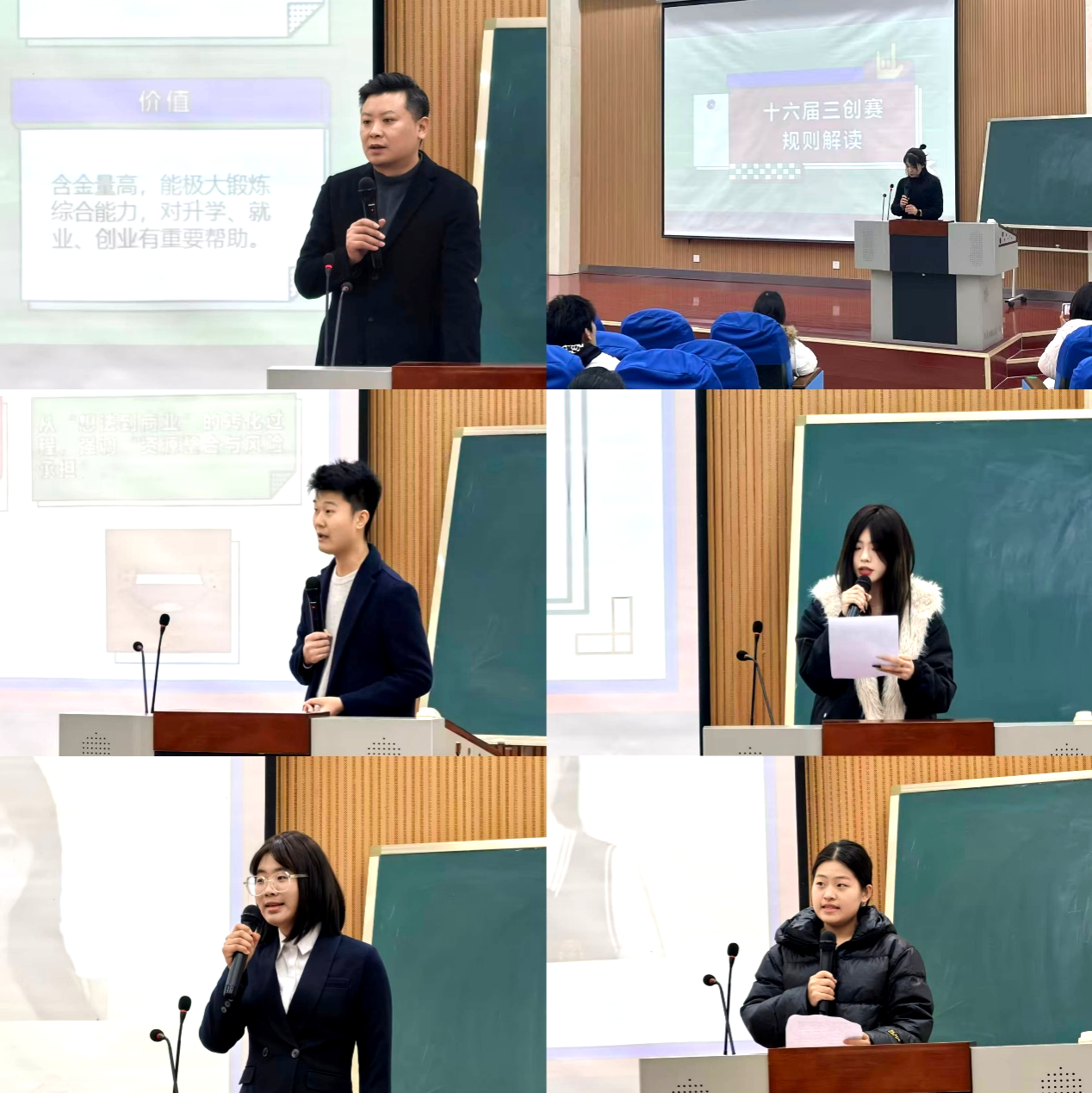 讲座伊始,董腾系统介绍了三创赛的发展历程、比赛主题与历年获奖情况,让师生对赛事有了整体认识。随后,他详细解读了大赛参赛资格、指导原则、材料提交要求以及团队与指导教师的组建规范,并结合往届违规案例进行分析,帮助学生清晰把握参赛规则与流程。韩露与刘涵结合以往带队获奖经验,分别从项目选题、商业计划书撰写、PPT制作与路演技巧等方面,为在场师生提供了切实可行的备赛建议。通过分析获奖项目的共同特点,指出常见问题及其应对策略,助力团队高效备赛、少走弯路,并讲解如何选择适合的参赛方向,如何做到“好故事、好想法、好实践、好呈现”。