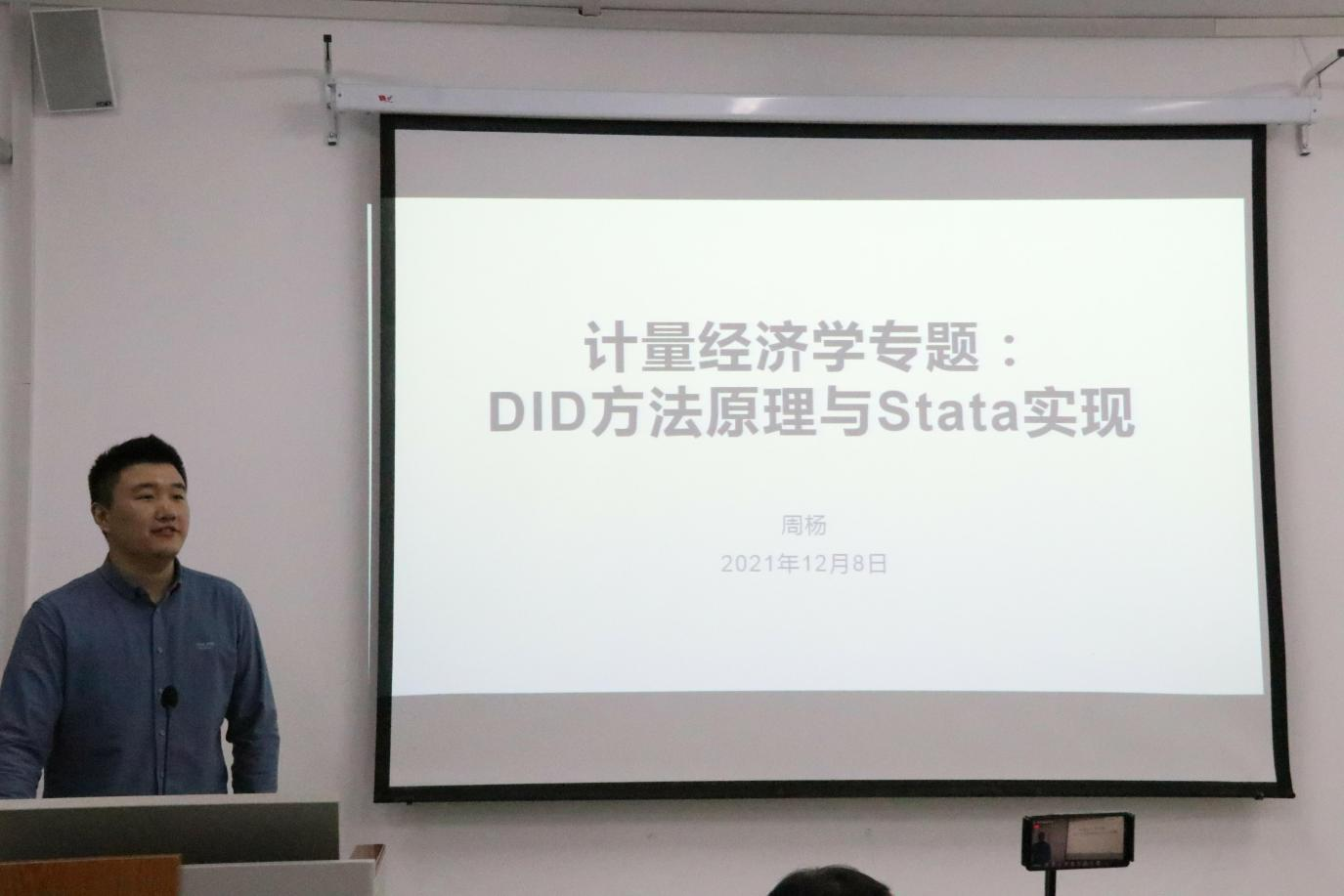 为进一步深化同学们对计量经济学的认识,2021年12月8日晚,周杨博士于3#B602教室作“计量经济学专题:DID方法原理与Stata实现”的学术报告,部分老师和2019级经济学班全体同学参加了本次报告。