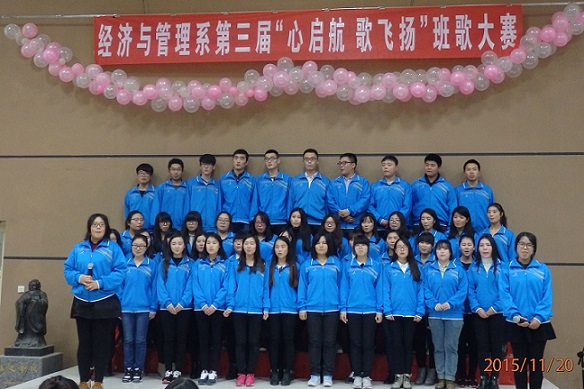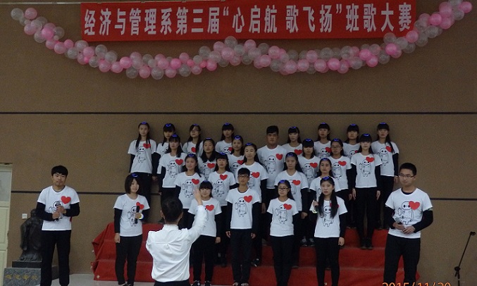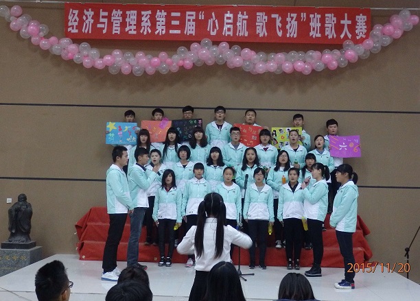 2015年11月20日晚7:00,经济与管理系第三届“心启航,歌飞扬”青春风采班歌大赛初赛第三场在系报告厅举行。各学生代表及参赛代表队参与此次比赛。 比赛开始,各参赛班级轮流上场,精心制作的PPT、视频在大屏幕播放,展示各班级文化风采。比赛期间,各班亮点纷纷展现,掀起全场一次次的高潮。最后2013级经济学一班、2014级经济学一班、2014级行政管理本科一班进入决赛。 此次比赛展现了各班级文化,体现了班级凝聚力,为同学们的青春留下了美好记忆,在嘹亮的歌声中点燃青春梦想。