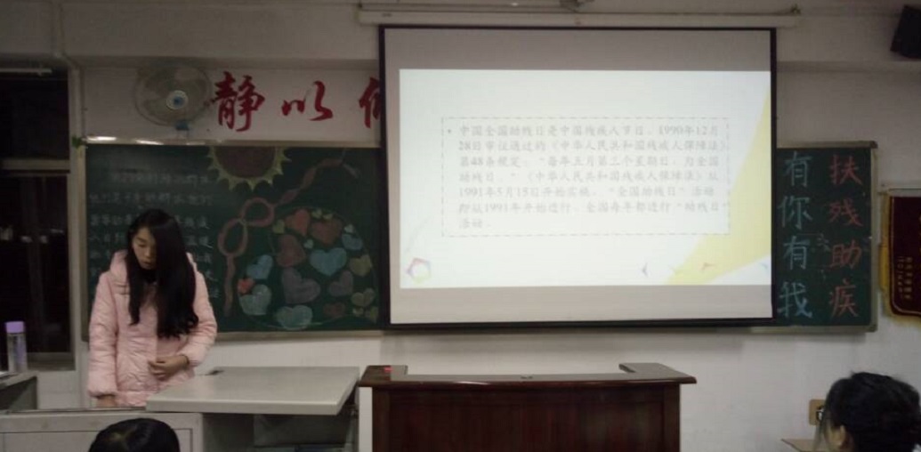 本次活动通过讲述残疾人案例、演讲、知识竞答等方式,组织同学们学习交流怎样关爱、帮助残疾人,力求让同学们将扶助残疾人行动落到实处,真正诠释本次活动的意义。同学们在谈到以后自己的行动时,积极踊跃发言,发表自己关于“扶助残疾人”的做法。