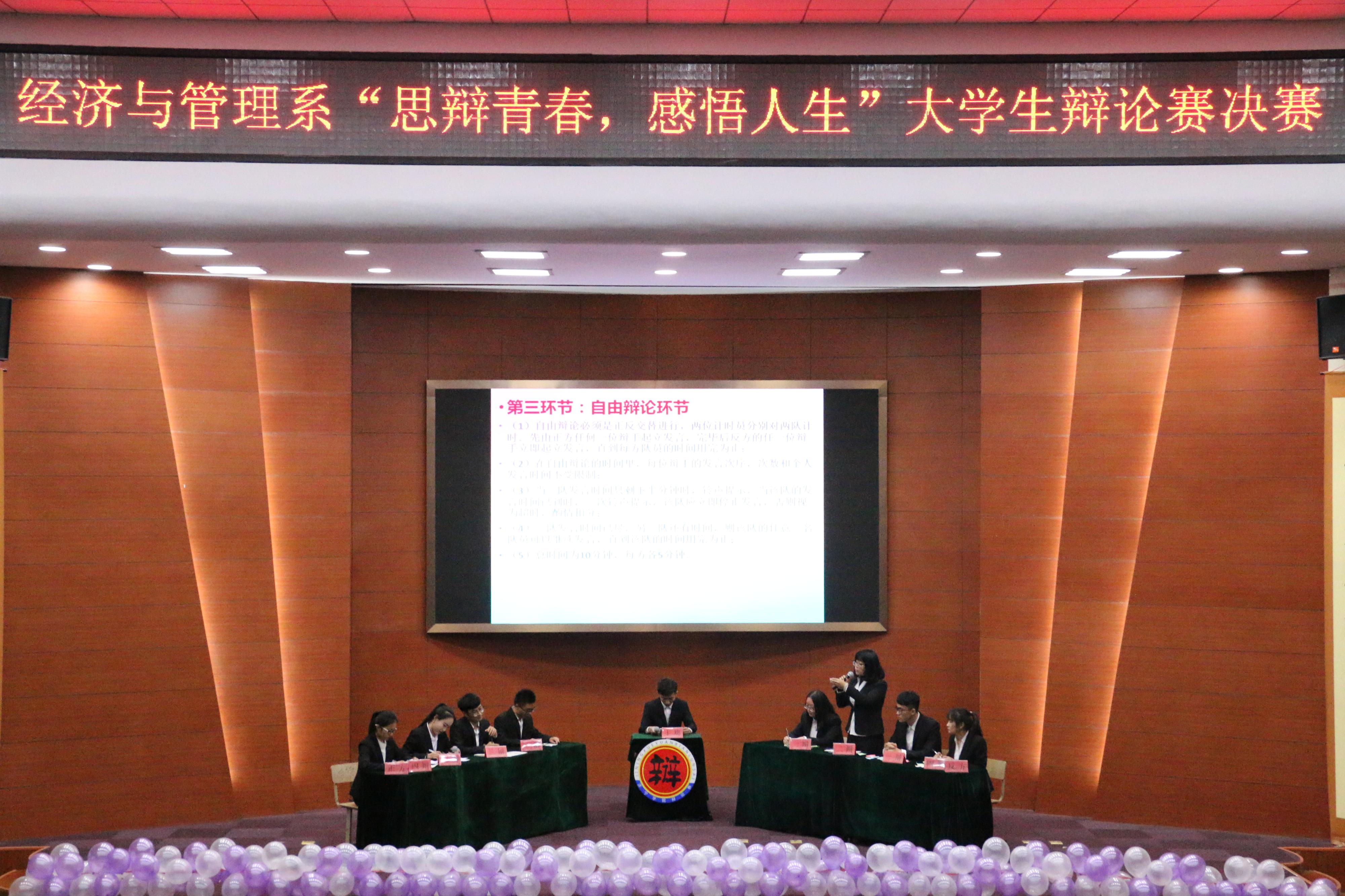 为学习贯彻十九大精神,培养学生的口才和表达能力,11月22日晚,经济与管理系主题为“思辨青春,感悟人生”为主题的大学生辩论赛决赛在理科楼报告厅圆满落幕。