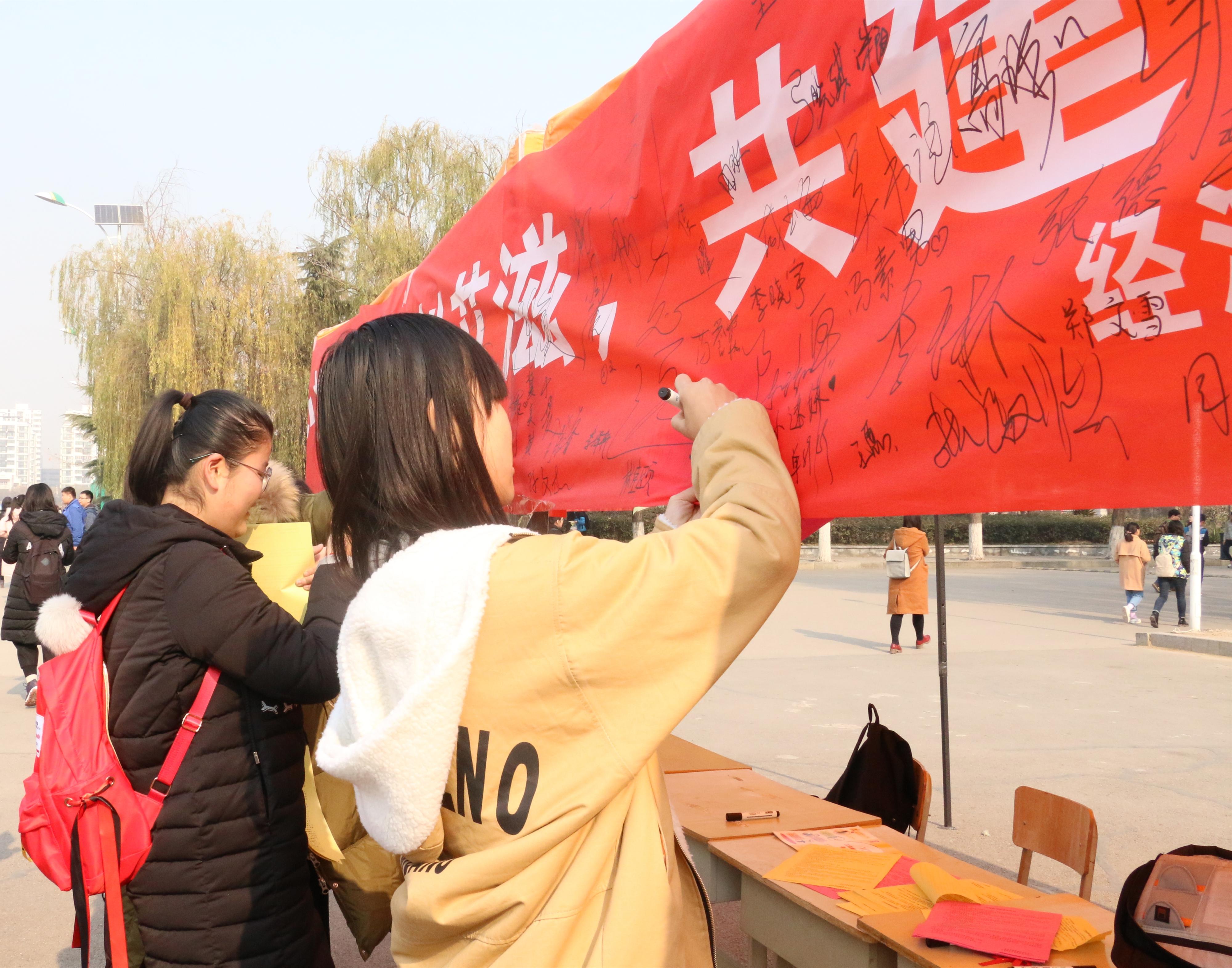 活动期间,曲阜市疾病预防控制中心提供了艾滋病预防等基本知识及教育读本。我系宣传人员在校北门设置展板并细致宣讲世界艾滋病日的由来、艾滋病的危害、传播途径、防治方法以及红丝带的精神和象征意义帮助大家更多了解艾滋病相关知识。同时发放宣传单以及为其他同学佩戴红丝带,以实际行动表示参与预防艾滋病的决心;同学们纷纷在宣传横幅上签字,以示承诺,以此增强同学们的自我防护意识与安全意识。