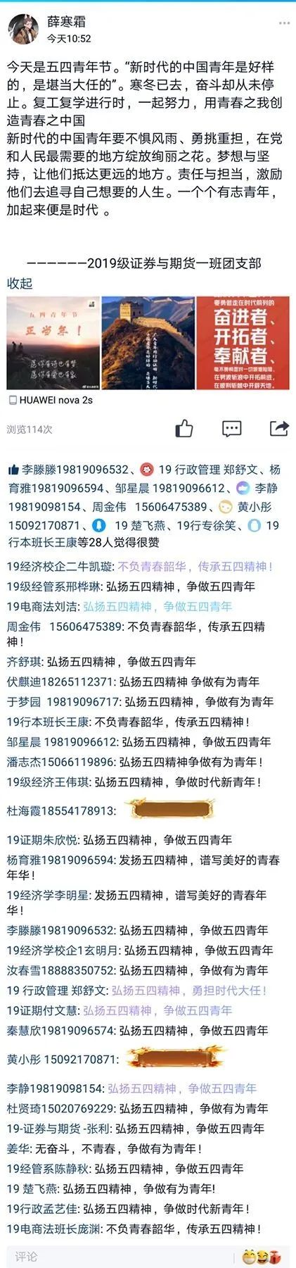 各团支部干部同学在班级群内号召班内同学分享自己的青春宣言,讨论彼此的青春感悟,进一步弘扬和传承五四精神。