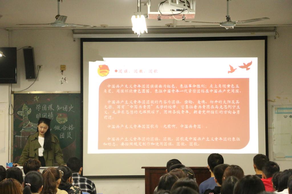 随后,她介绍了团旗、团徽、团歌、共青团的成立价值与共青团的使命,向同学们发起为实现共产主义事业而奋斗的号召,使同学们对团的思想有了更深的认识。