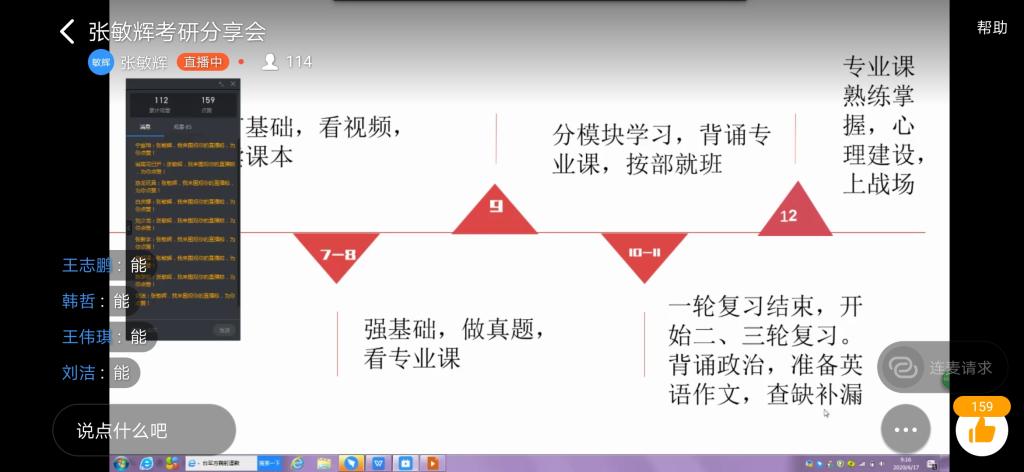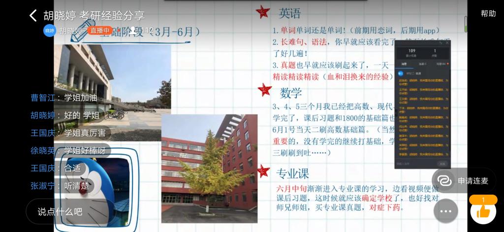 会上,学生代表们重点从考研常识、整体规划、专业复习以及做题技巧这四个方面进行了全面的介绍,为同学们指明了考研路上的方向,提供了宝贵的经验。