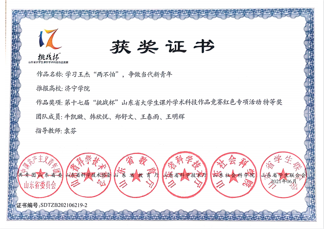 荣获第十七届“挑战杯”山东省大学生课外学术科技作品竞赛红色专项活动特等奖