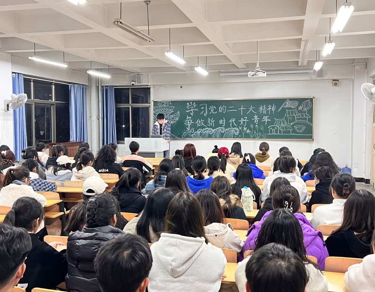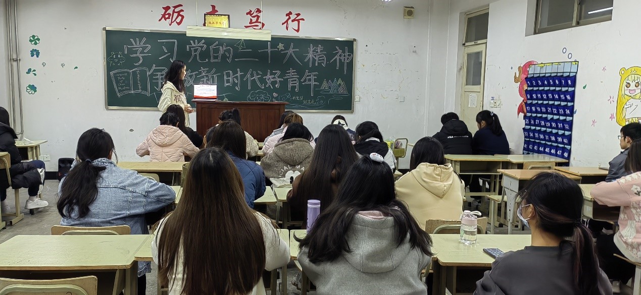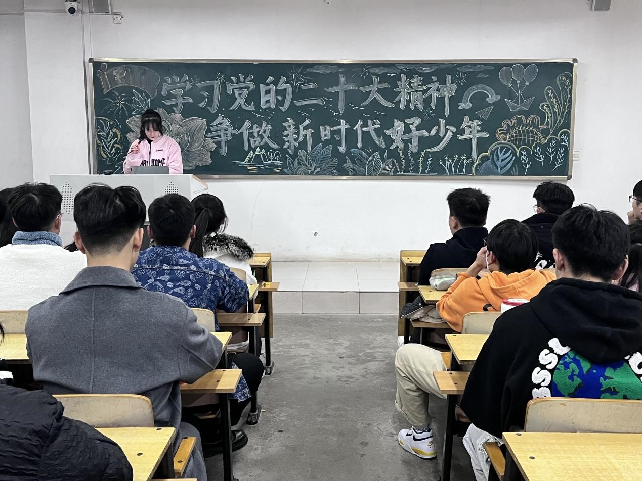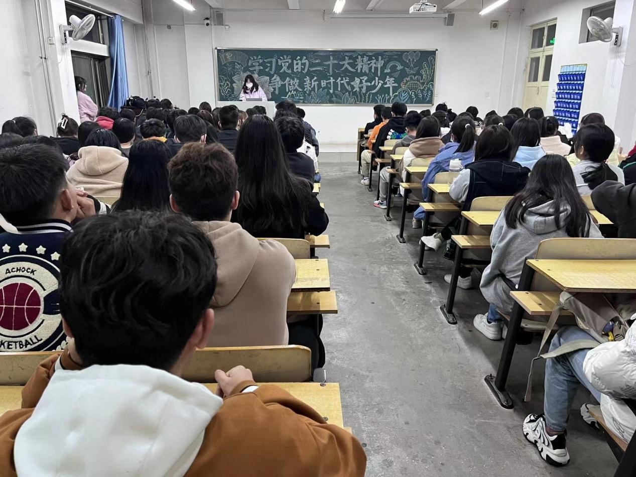 活动中,各级团支书深入学生队伍,以《时政微记录|党的二十大胜利召开》宣传视频为开篇,带领青年学子在荧幕中感受党的二十大召开盛况。随后,各班团支书带领同学们重温了《中国共产党章程》内容,对《中国共产党章程》修改、新增的部分、《中国共产党章程》的重要意义等内容进行了详细解释,并结合自身工作、学习实际畅谈理解和感悟。最后,团支书带领同学们原原本本学习了党的二十大主要报告内容,动员广大青年能够认真贯彻党的二十大精神,坚定用美好青春诠释新时代青年的使命担当。