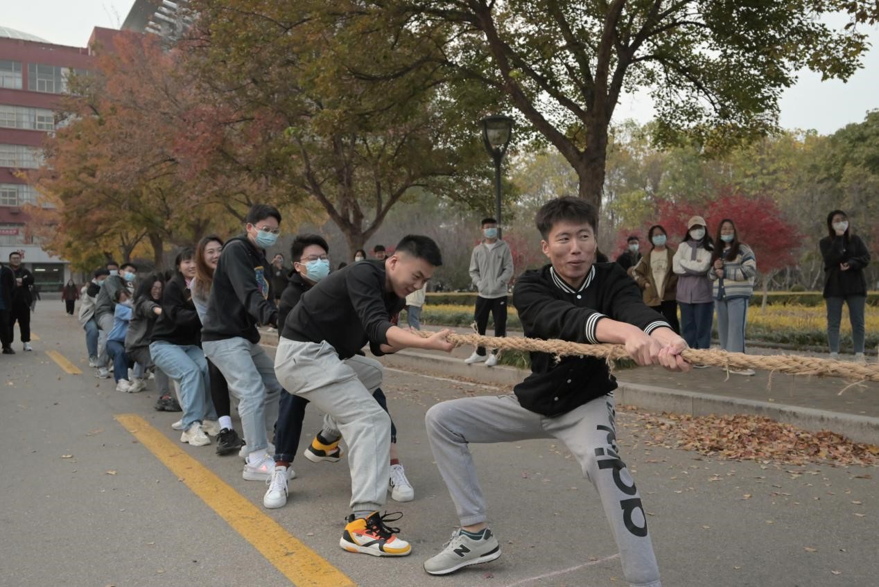 力拔山河气盖世,青春之力蓄待发。随着一声哨响,参赛队员们口中一起高呼“一二,一二,”一根绳,一条心,一声响。场外加油声与欢呼声此起彼伏。