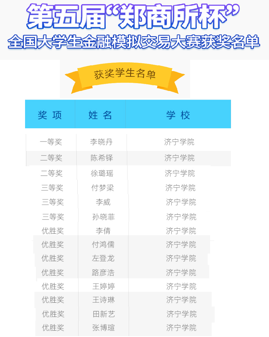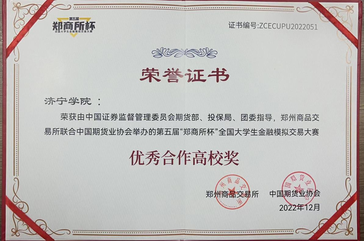 由中国证监会期货部、投保局、证监会团委指导,郑州商品交易所和中国期货业协会共同主办的第五届“郑商所杯”全国大学生金融模拟交易大赛落下帷幕,儒商学院金融工程专业学生在本次比赛中取得了优异成绩,其中李晓丹同学获得全国一等奖,陈希铎、徐璐瑶两位同学分别获得全国二等奖,付梦梁、李威、孙晓菲三位同学分别获得全国三等奖,李倩等八位同学获得比赛优胜奖,另有多位同学获得鼓励奖,充分展现了学生出色的专业素养和专业技能,以及较强的金融实践能力。本届比赛儒商学院共组织253名同学报名参赛。我校获得“优秀合作高校奖”。