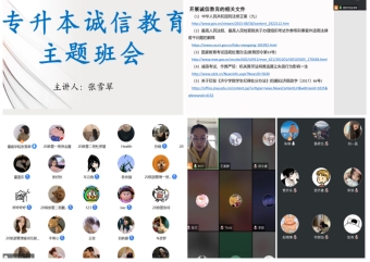 为做好2023年专升本考试相关工作,切实加强专升本考试期间的诚信教育,进一步端正考风、严肃考纪,营造文明、诚信考试的良好氛围,促进良好校风和学风的形成,近日,儒商学院辅导员朱琳、张雪翠和陈梦园分别为互联网金融、旅游管理及行政管理专业共289名专升本考生召开诚信教育主题班会。