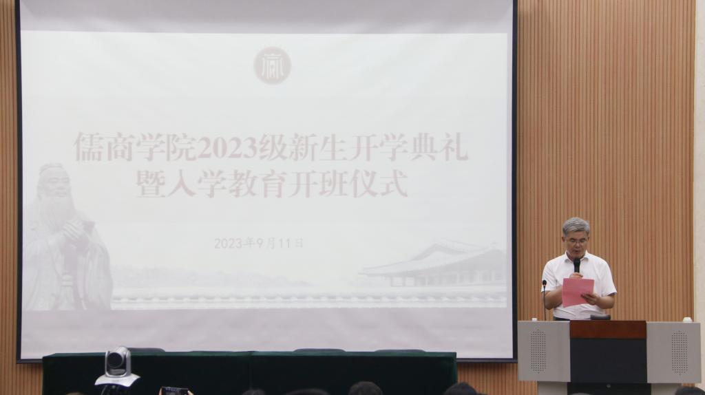 儒商学院党委书记乔东华代表学院致辞,对全体新生的到来表示热烈地欢迎。他表示,大学时光是人生最为珍贵、最为精彩的黄金阶段,广大青年学子要珍惜韶华,不负青春,悟学习之道,做事之道,为人之道,增强服务国家和人民的社会责任感,培养勇于探索的创新精神,提高解决问题的实践能力。乔东华向同学们提出三点希望:一是志存高远,方能登高望远,立鸿鹄志,做奋斗者,与新时代同心同力同向同行,肩负起新时代所赋予的历史使命。二是勤学苦练,练就过硬本领,做好大学规划,求真学问、练真本领,把报国之志转化为实际行动,让勤奋学习成为青春远航的动力,让增长本领成为青春搏击的能量。三是勇于实践,促进知行合一,把知识和实践、创新紧密结合在躬身实践中提高能力、培养素养、历练精神,为走向社会、成就事业打下坚实基础。