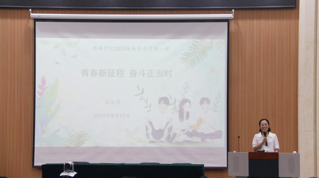 9月11日晚,儒商学院2023级新生“开学第一课”在3号楼报告厅开讲,并同步在5个分会场直播。该院院长霍雨慧以《青春新征程 奋斗正当时》为题,为1122名新生授课。
