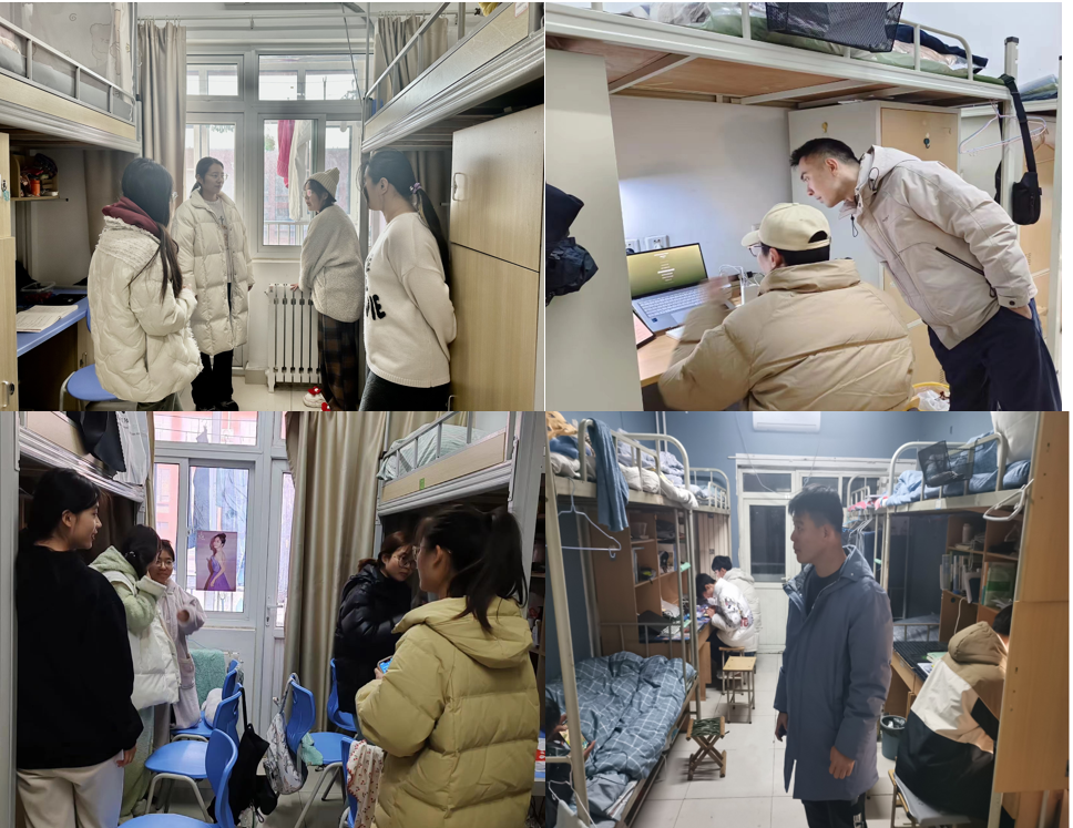 2月26-27日学院党委副书记孔国良带领全体辅导员下沉到各年级学生宿舍,深入学生一线,仔细检查学生宿舍的环境卫生,认真排查消防安全、违禁物品、消毒通风等方面的安全隐患。对检查出的问题,及时指出整改方向和整改方法,做到以查促改,防范未然。检查过程中,与学生亲切地交谈,关心同学们是否调整好状态、适应新学期的生活,鼓励同学们要养成良好的生活习惯,营造积极健康的宿舍氛围。