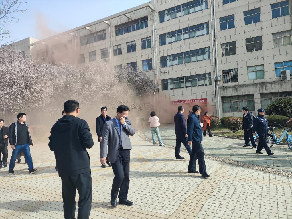 在演练现场,随着烟雾弹燃起、警报声响起,教学区8号楼A座三楼层弱电间发生“火灾”,冒出滚滚浓烟,所有疏散引导人员立即到达指定位置,引导楼内学生快速疏散,指导学生弯着腰、用毛巾等捂住口鼻,根据现场疏散标志,沿着预先指定疏散路线快速前进,穿越烟雾区域,有序撤离到校园的安全地带,集合后,各班负责人立刻清点人数,报告给各年级辅导员,确保所有人员安全抵达,学校灭火行动组立即奔赴火场实施灭火。