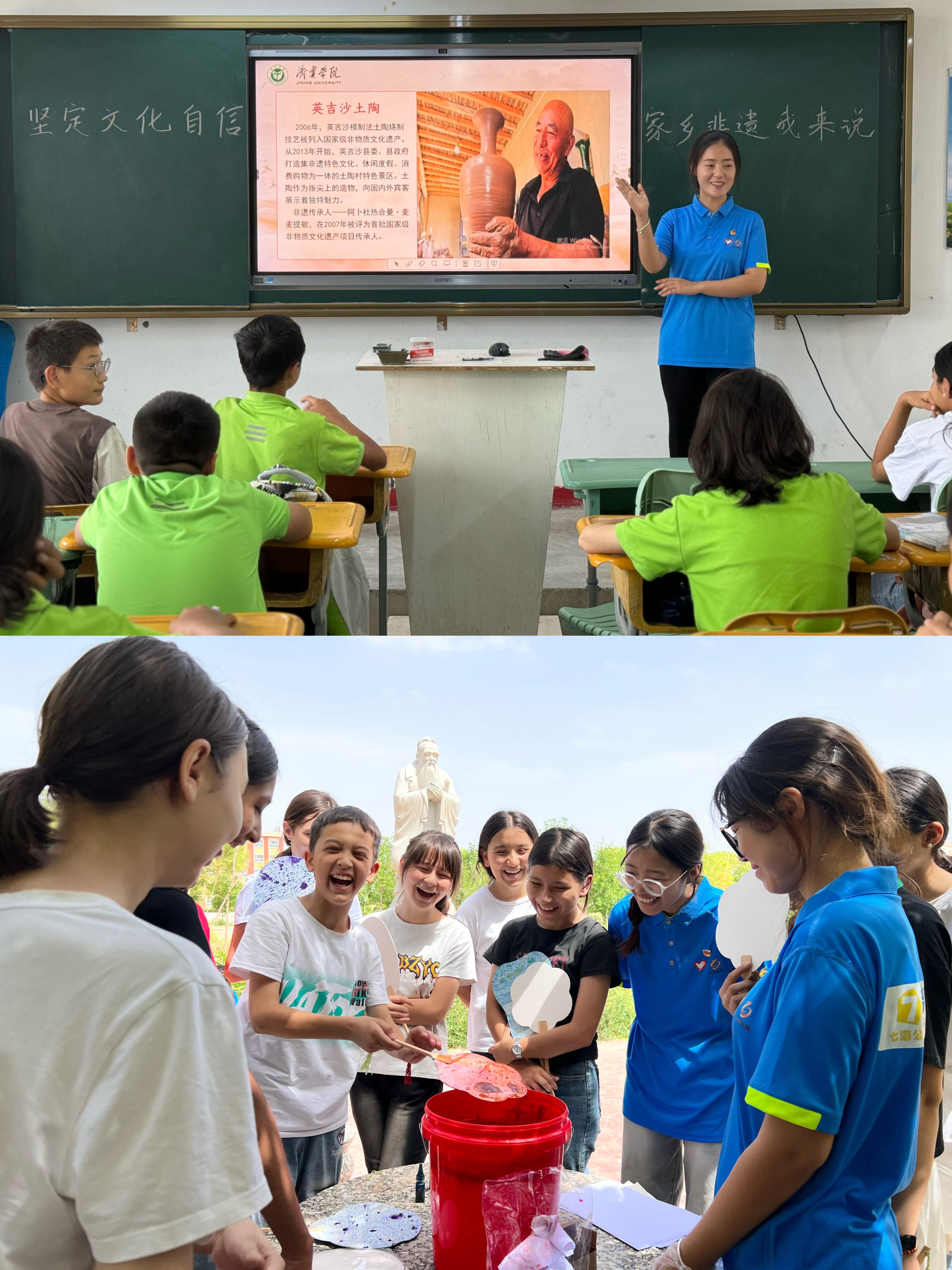 为了进一步传承发扬非遗文化,支教队认真地将寻访调研成果转化为生动的教学素材,带进支教的学校课堂。通过“坚定文化自信,家乡非遗我来说”主题宣讲活动,引导孩子们学习家乡非遗文化的历史渊源、艺术价值和社会意义,更激发了他们对家乡文化的自豪感和保护传承的责任感。同时,支教队精心策划了非遗漆扇制作体验,让鲁喀两地学生在互动中促进交流与融合,共同传承和弘扬中华优秀传统文化,铸牢中华民族共同体意识。