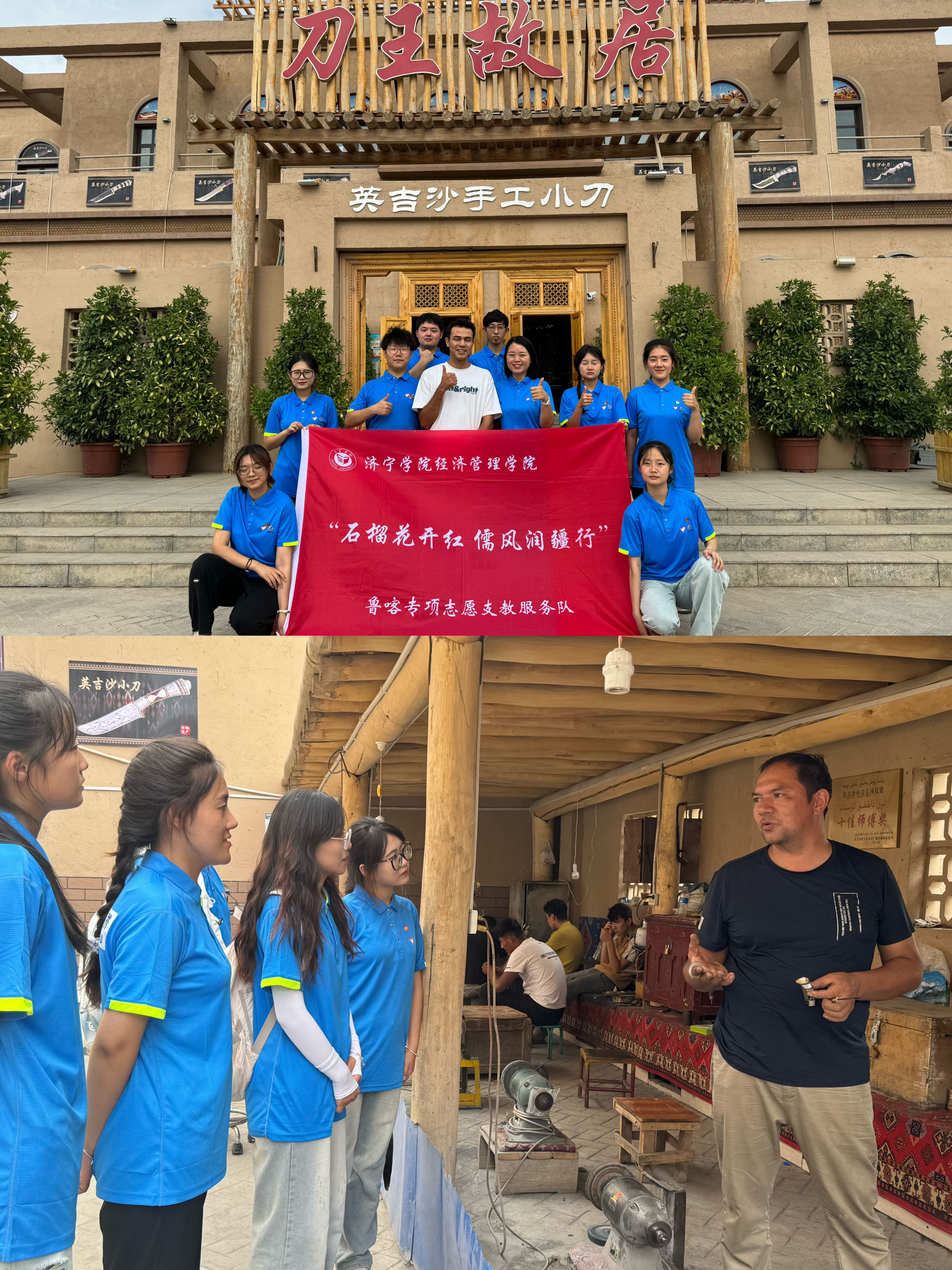 英吉沙县是著名的“中国小刀之乡”,支教队走进小刀村,在当地工作人员的引领下,现场观摩了工匠们选材、锻打、淬火、开刃、镶嵌等一道道繁琐而精细的手工制作工序。一烧一凿,一磨一钻,工匠们巧手雕琢,一把把精美刀具在火花与温度的碰撞之中诞生,在锻打声声中流传百年,支教队深刻感受到了英吉沙小刀背后所承载的匠人精神与文化传承的厚重。