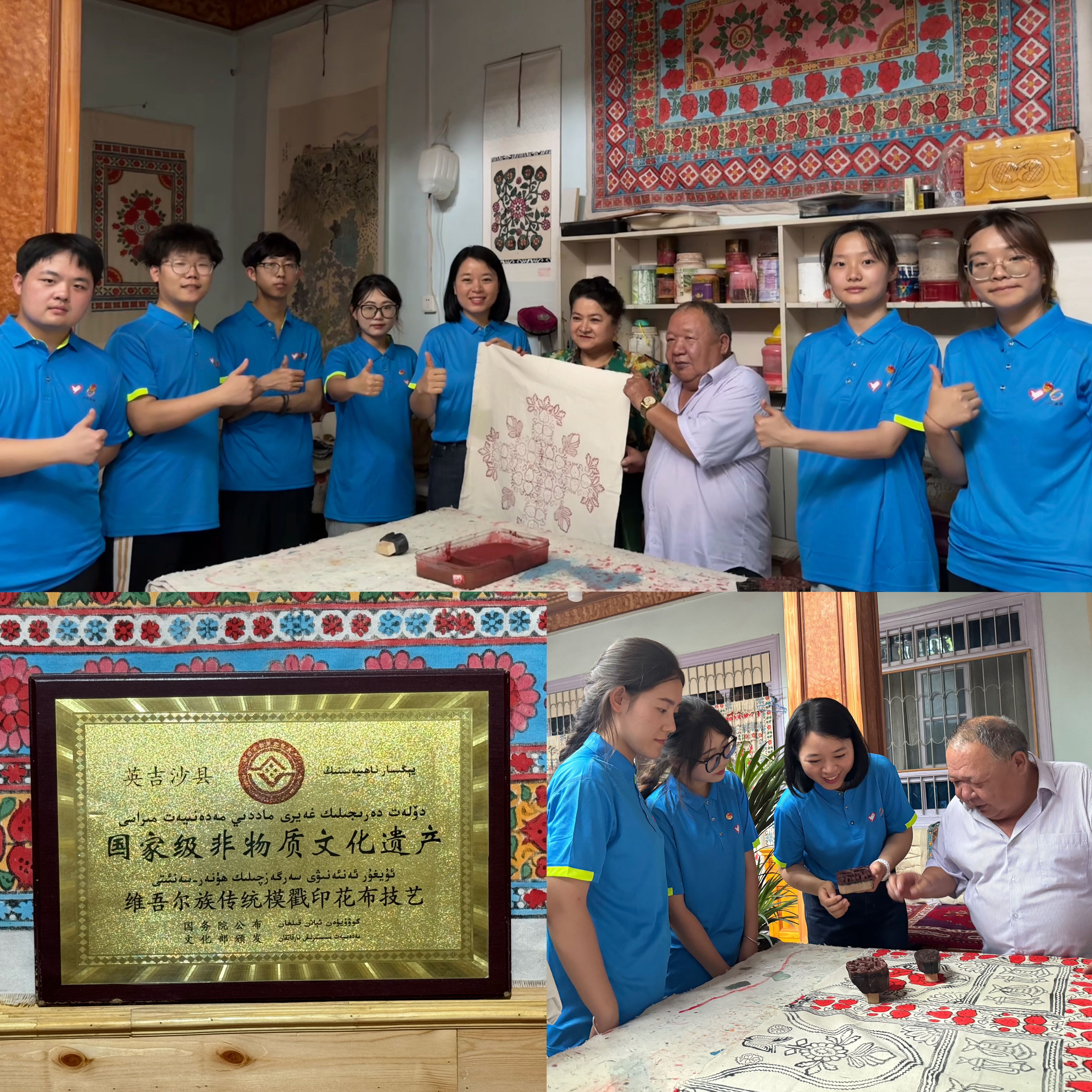 支教队在英吉沙县专程拜访了国家级非物质文化遗产模戳印花布技艺传承人吾吉阿西木·吾舒尔老师。吾吉阿西木老师热情接待了支教队一行,他向大家讲解了模戳印花布的制作工序,从设计图案、雕刻模戳到手工印花,每一步都透露着对美的极致追求和对传统文化的敬畏之心。他亲自演示了精湛的印花工艺,并向支教队赠送了代表民族团结一家亲的“石榴纹样”印花布。访谈中,他的话语里充满了对年轻一代的期许,希望更多年轻人能够加入到非遗文化保护的行列。