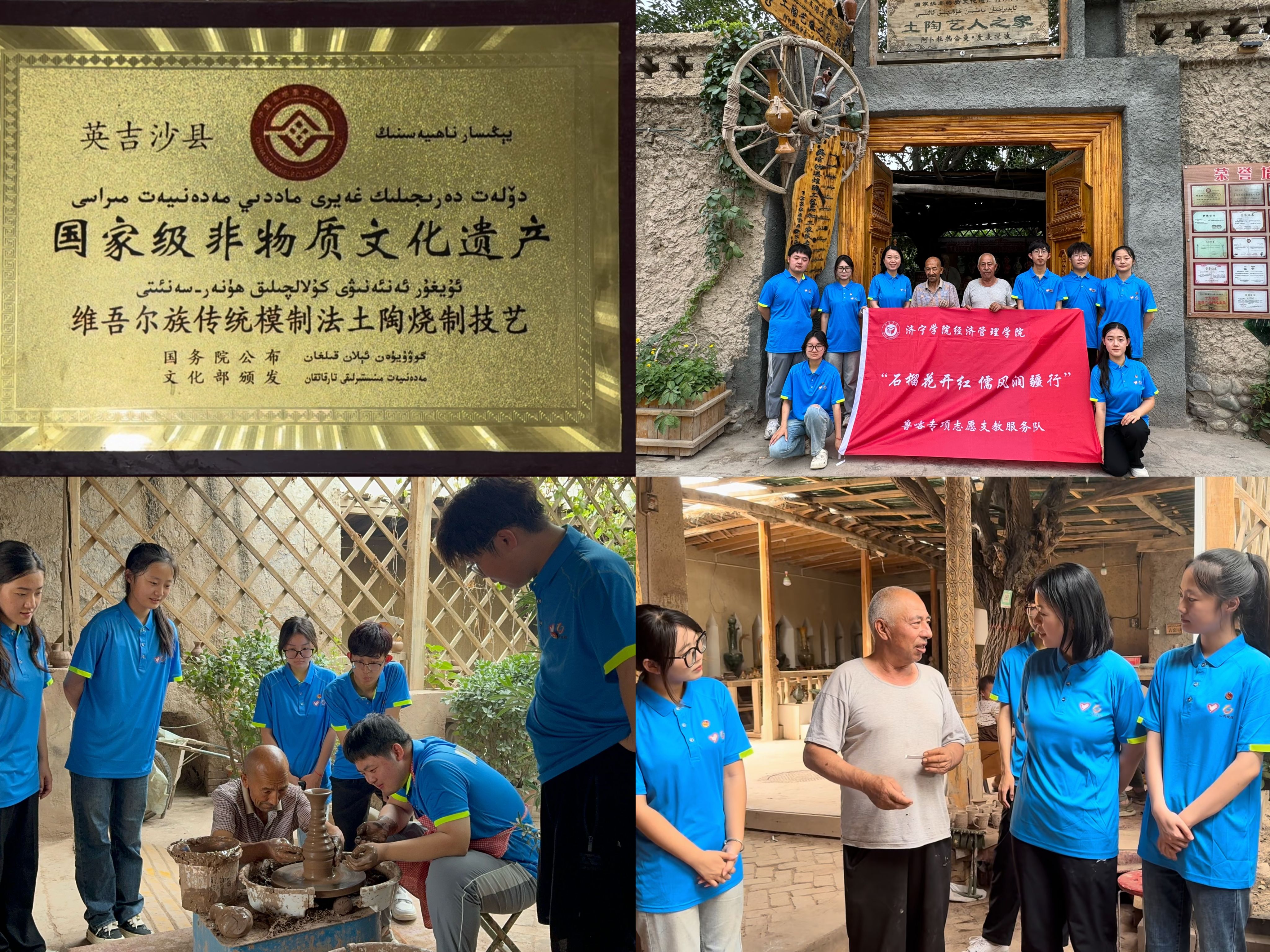 在被誉为“土陶村”的英吉沙县恰克日库依村,支教队拜访了国家级非物质文化遗产模制法土陶烧制技艺传承人阿不都热合曼·买买提明老师。阿不都热合曼老师引领支教队近距离观摩了土陶挑泥、揉泥、拉坯、塑型、晾坯、修坯、烧制等环节并讲解了技艺精髓,他回忆了自己儿时学习土陶制作手艺的故事,分享了自己对土陶文化传承的执着与期待,让支教队队员们深受感动。在老师的热情邀请下,同学们亲身体验了土陶制作的乐趣,深刻感受到土陶技艺的独特魅力。