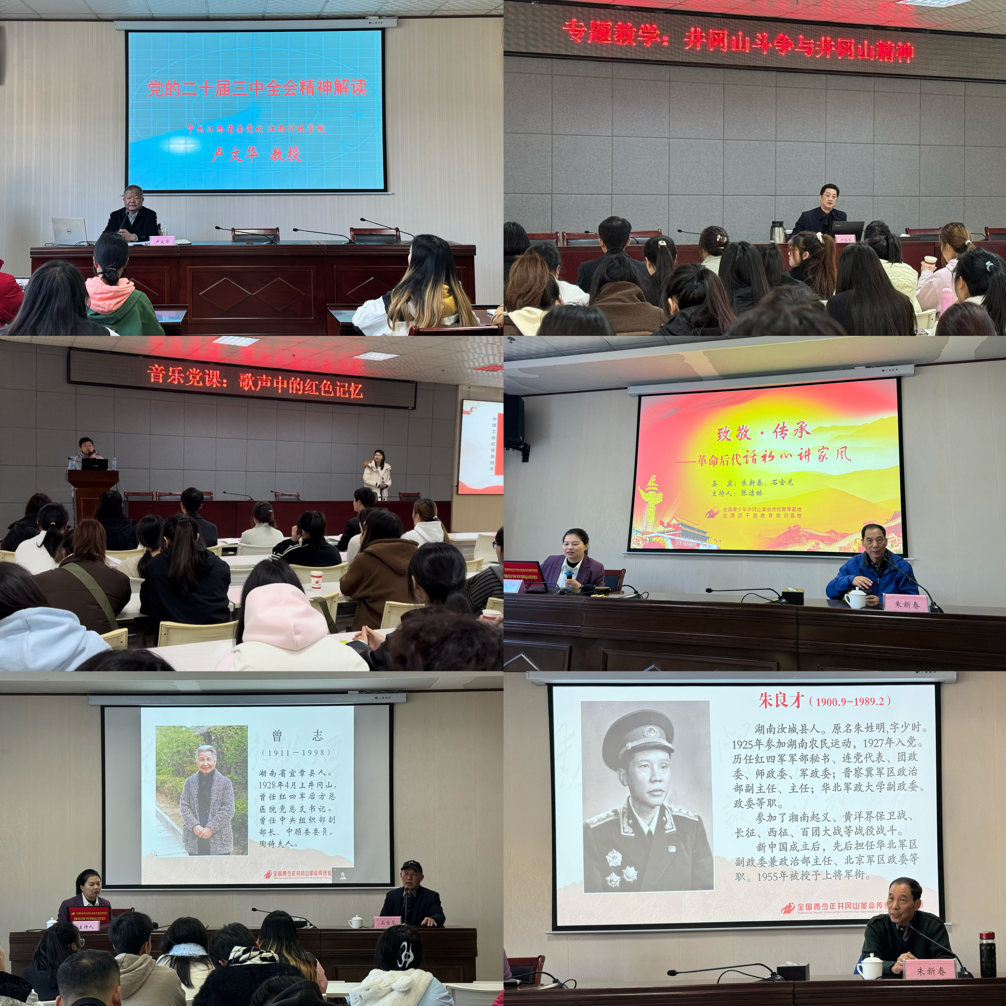 理论辅导环节,江西省委党校卢文华教授作《党的二十届三中全会精神解读》报告,全国青少年井冈山革命传统教育基地管理中心钟国华教授作《井冈山斗争与井冈山精神》专题教学,基地刘小如和龚文慧老师上《歌声中的红色记忆》党课。中心特邀井冈山斗争时期老红军曾志之孙石金龙、开国上将朱良才之子朱新春两位红军后代深情讲述革命英雄故事。专家们课上旁征博引、深入浅出的讲解,内容丰富,思想深刻,让宣讲团成员们进一步坚定理想信念,增强了历史使命感和责任感。