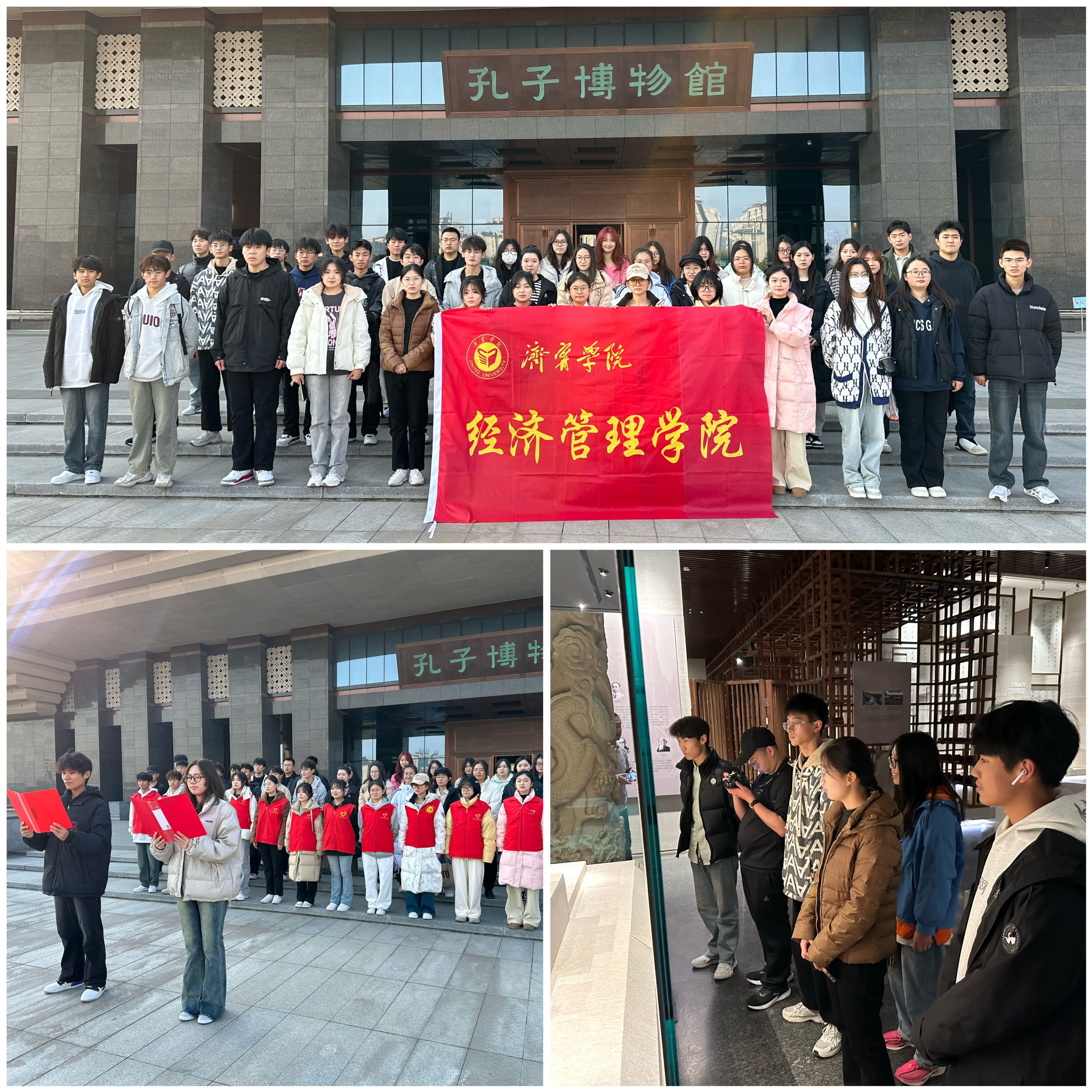 志愿者们走进孔子博物馆开展儒家经典诵读活动,并为游客提供文明引导服务。朗朗的诵读声展现了同学们传承和弘扬中华优秀传统文化的决心和信心。服务期间,志愿者们耐心地引导游客参观,为游客们讲述着文物背后的历史故事,协助工作人员维护场馆秩序,用实际行动为传承和弘扬传统文化贡献青春力量。