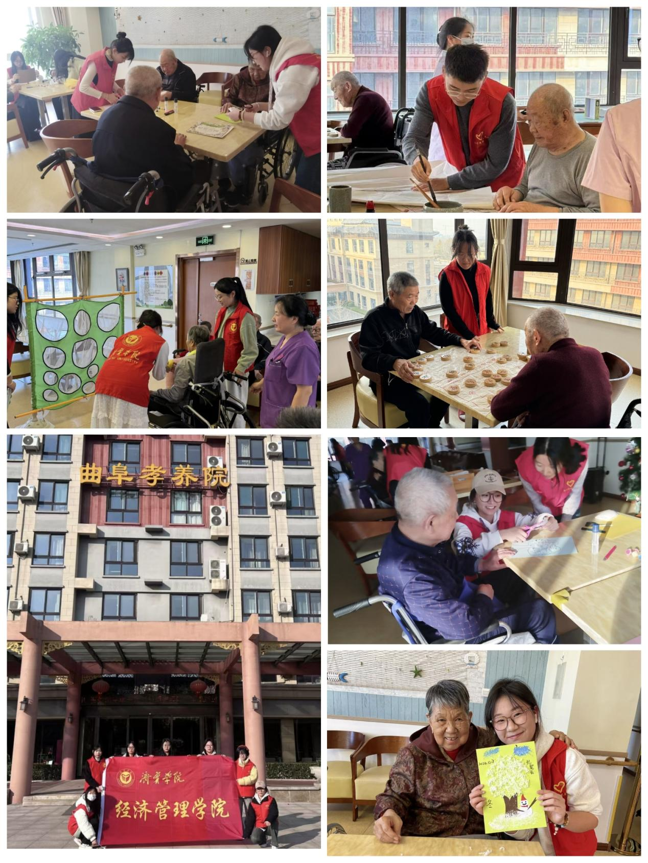 在曲阜孝养院,志愿者们围在老人们身边,耐心地陪伴他们聊天、下棋、写书法、制作手工,关心他们的身体状况和生活情况,倾听他们的故事,分享彼此生活的点滴。朝气蓬勃的大学生志愿者给老人们送去了冬日的温暖与关爱,养老院内充满着欢声笑语,志愿者们用实际行动传递着爱与正能量。