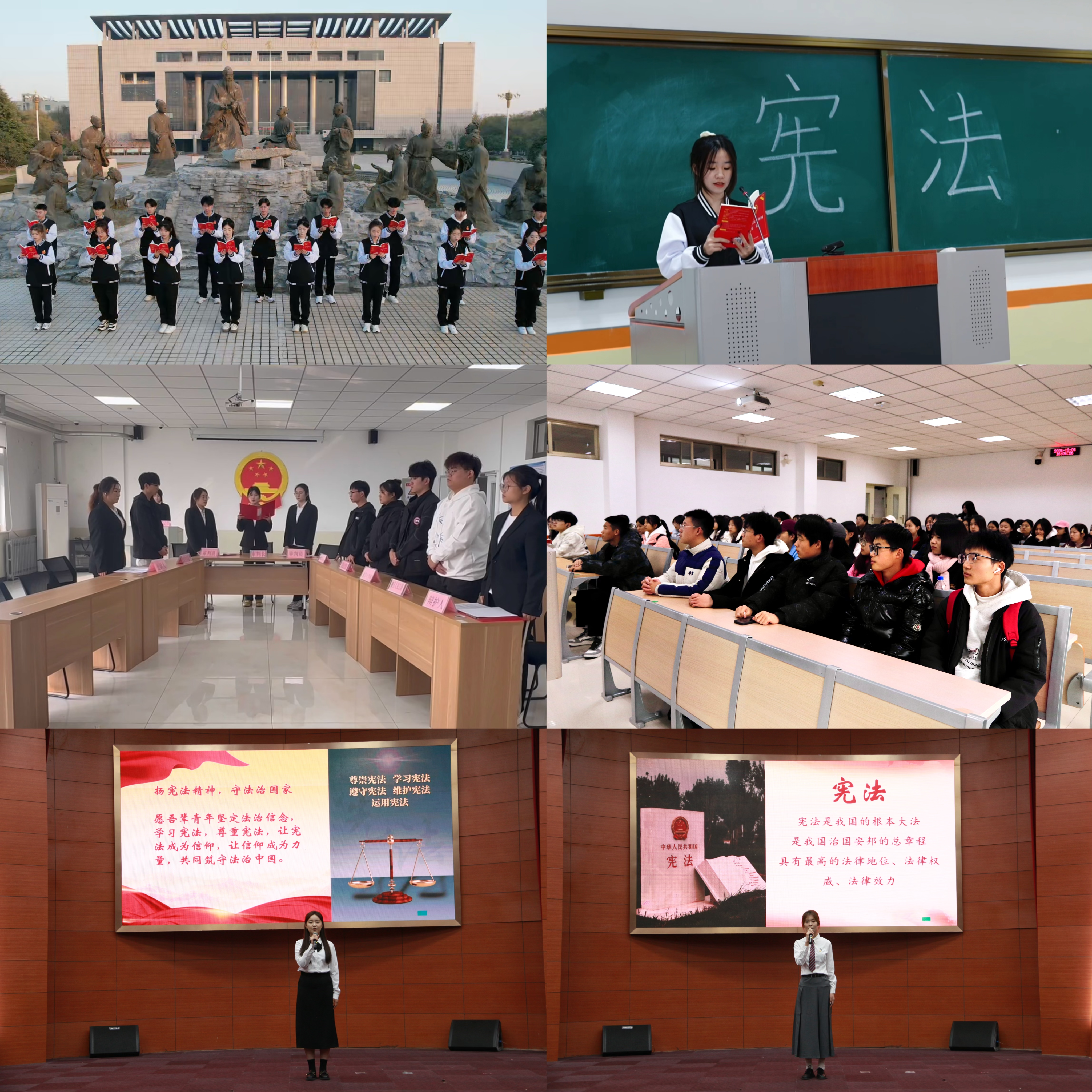 活动期间,学校组织开展“国家宪法日”主题升旗仪式,千余名学生齐聚圣贤广场,通过国旗下的演讲、宪法宣誓、合唱《宪法伴我们成长》歌曲等形式,表达对祖国的热爱和对宪法的敬畏。开展国家宪法日主题宣传和签名活动,通过设立咨询台、悬挂宣传横幅、摆放宣传展板、发放宣传资料、交流互动等形式,向师生普及宪法相关知识,积极营造学法、知法、懂法、守法的良好氛围。举办宪法晨读,组织全校师生收看全国教育系统“宪法晨读”活动直播,聆听宪法“声音”,感受宪法作为治国安邦根本大法的内涵与精髓;大学生法律咨询协会在校园内开展宪法晨读,通过诵读宪法条文,切身感受宪法的庄严与神圣。举办大学生宪法演讲比赛、模拟法庭活动,引导学生围绕宪法与个人成长、社会和谐、国家治理等主题,表达对宪法的深刻思考与理解,增强学生对宪法权威的认同感和对法治建设的使命感。